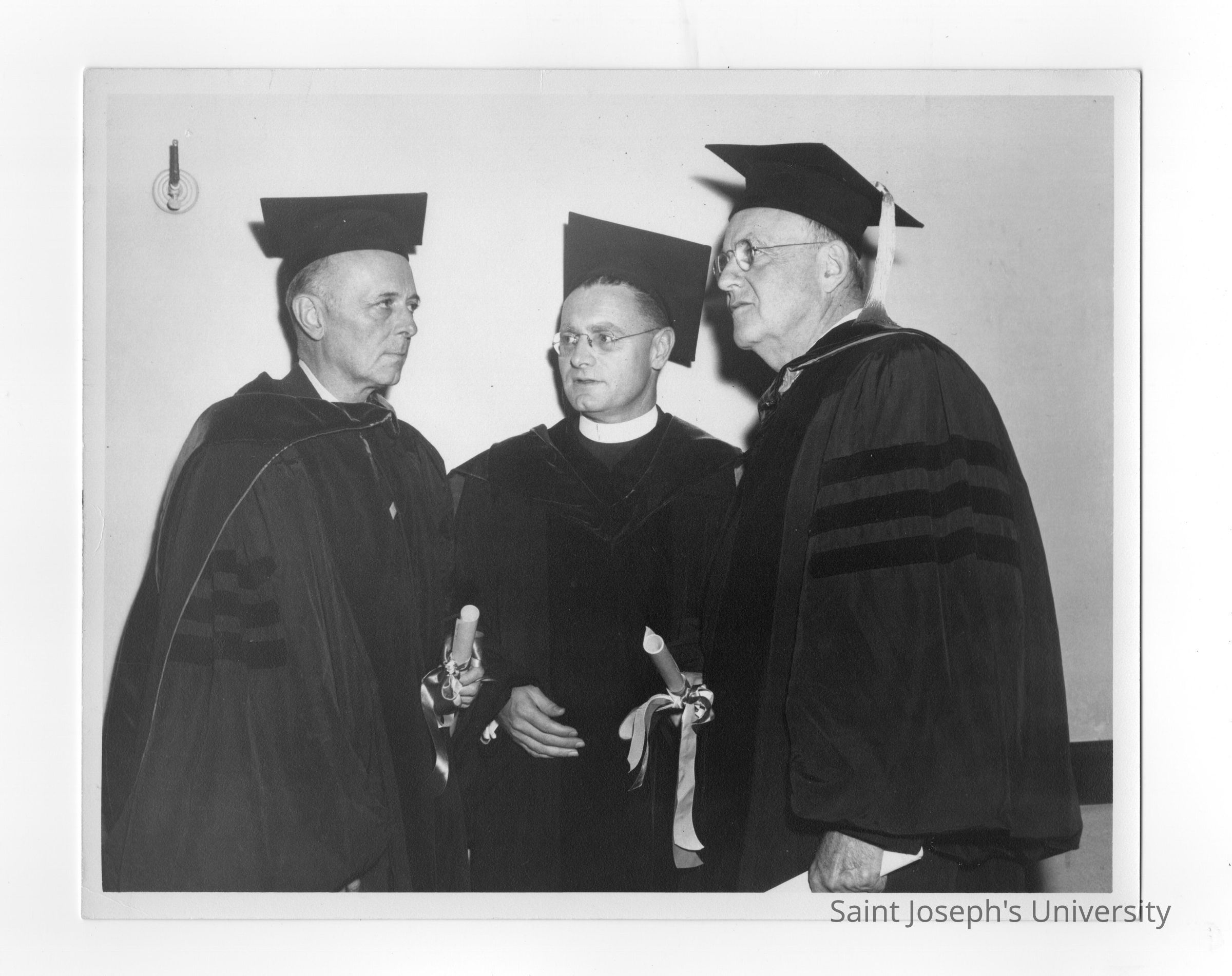 Edward G. Jacklin, S.J., with honorary degree recipients, Thomas K. Finletter and John Foster Dulles, during academic convocation, October 28, 1951, as part of centennial celebration.