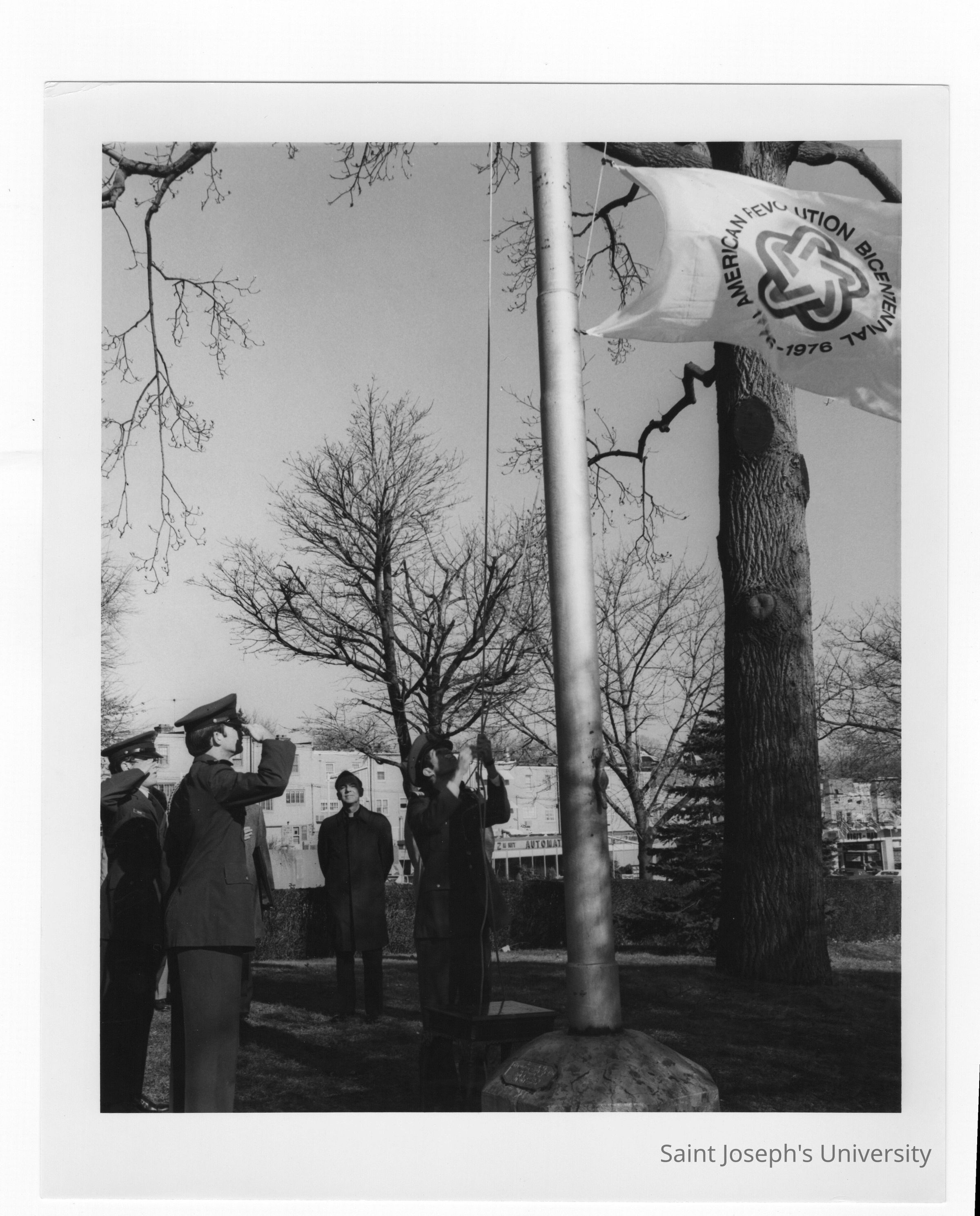 Terrence Toland, S.J., and members of ROTC raising U.S. Bicentennial flag during 125th anniversary of Saint Joseph's College in 1976.
