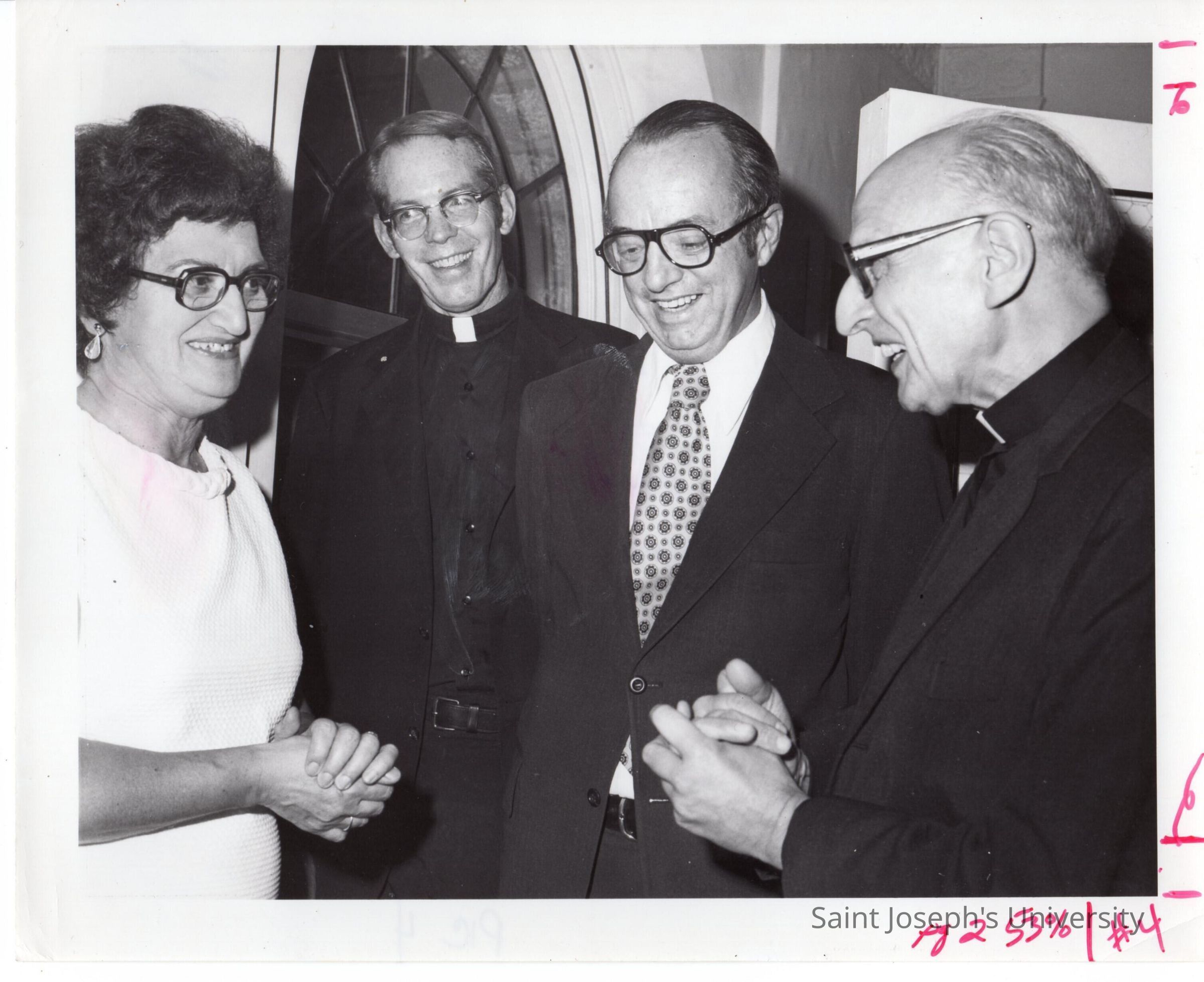 Opening of exhibit, Jesuit Spirit in the Arts, in Boland Hall, July 30, 1976, as part of celebration of 125th anniversary of Saint Joseph's College with Madeline Conti, James Connors (?), Thomas Melady, and Rev. Pedro Arrupe, S.J.Entry/Object ID