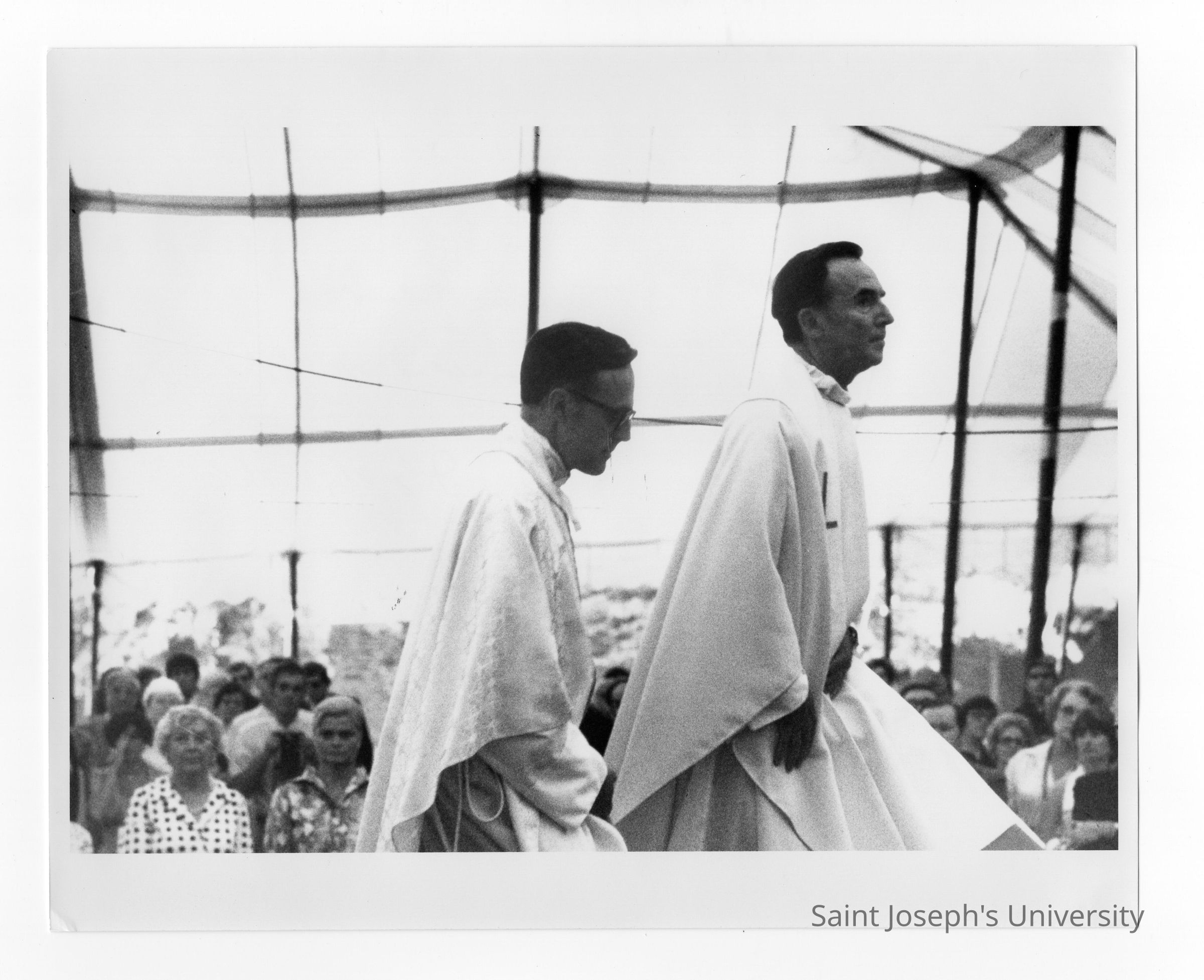 Terrence Toland, S.J., and Donald I. MacLean, S.J. at mass held July 31, 1976, on Gest Lawn prior to academic convocation during SJC 125th anniversary celebration.