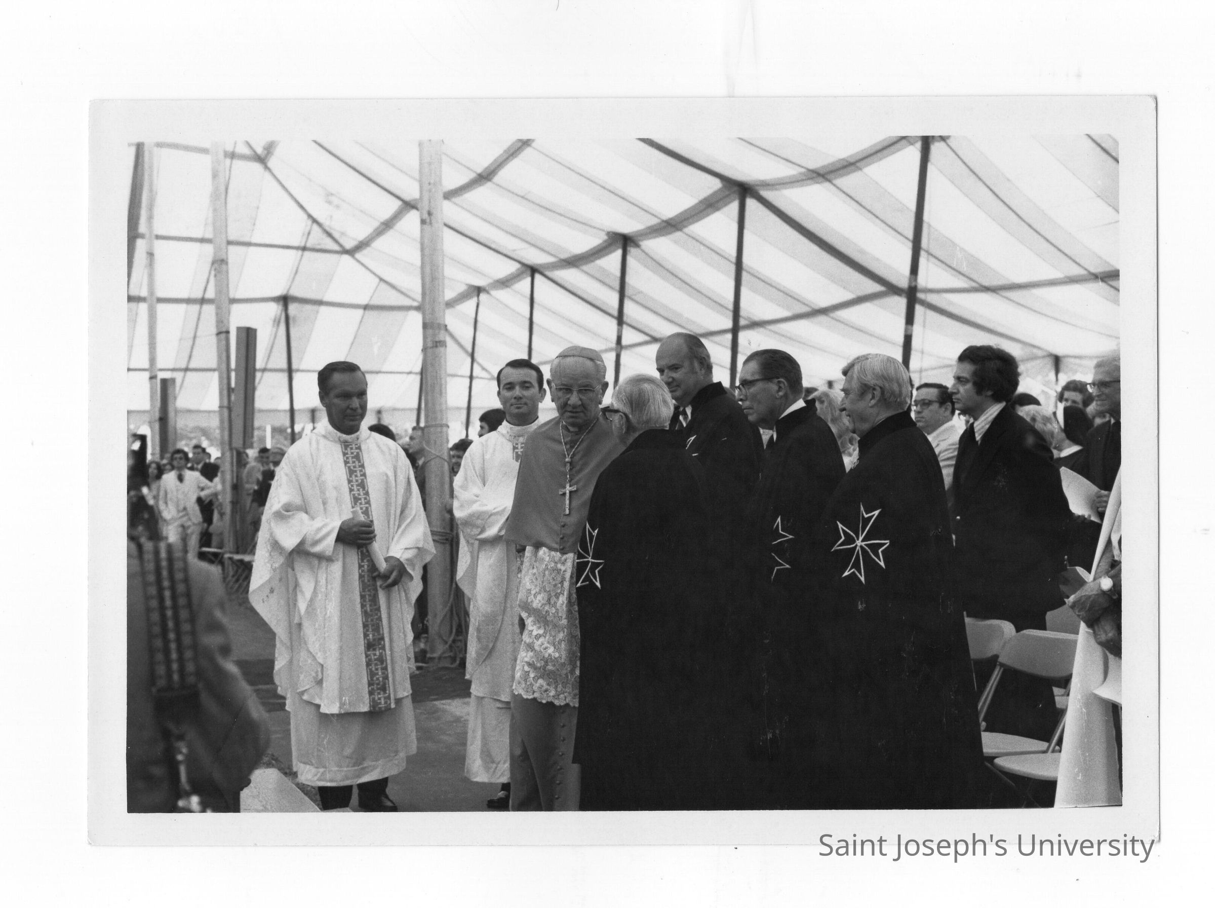 Cardinal John Krol and James Moore, S.J., with Knights of Malta during Mass held July 31, 1976, on Gest Lawn prior to academic convocation during SJC 125th anniversary celebration.
