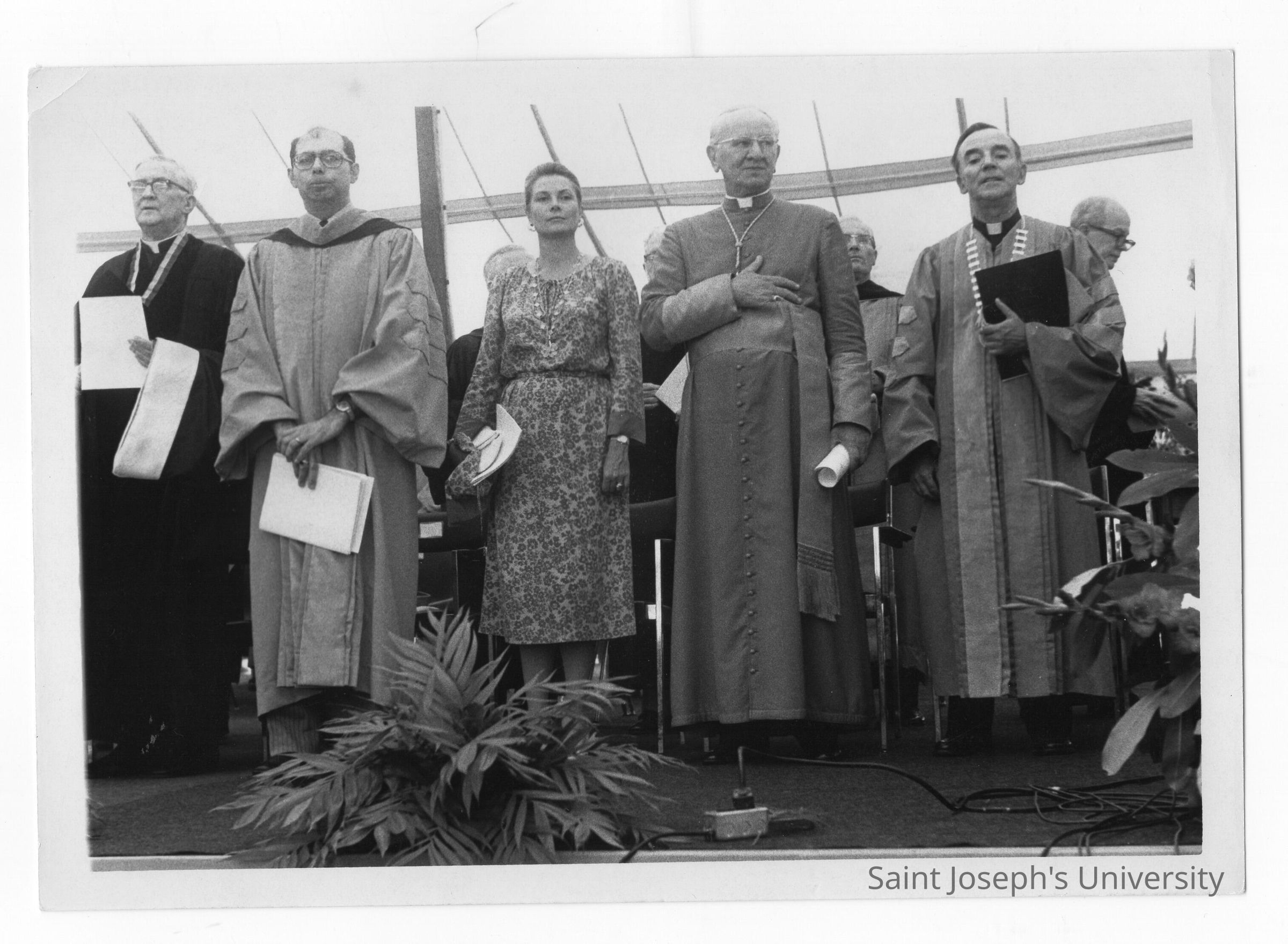Princess Grace of Monaco, Cardinal John Krol, Terrence Toland, S.J., William F. Maloney, S.J. at academic convocation held on Gest Lawn, July 31, 1976, as part of SJC 125th anniversary celebration.