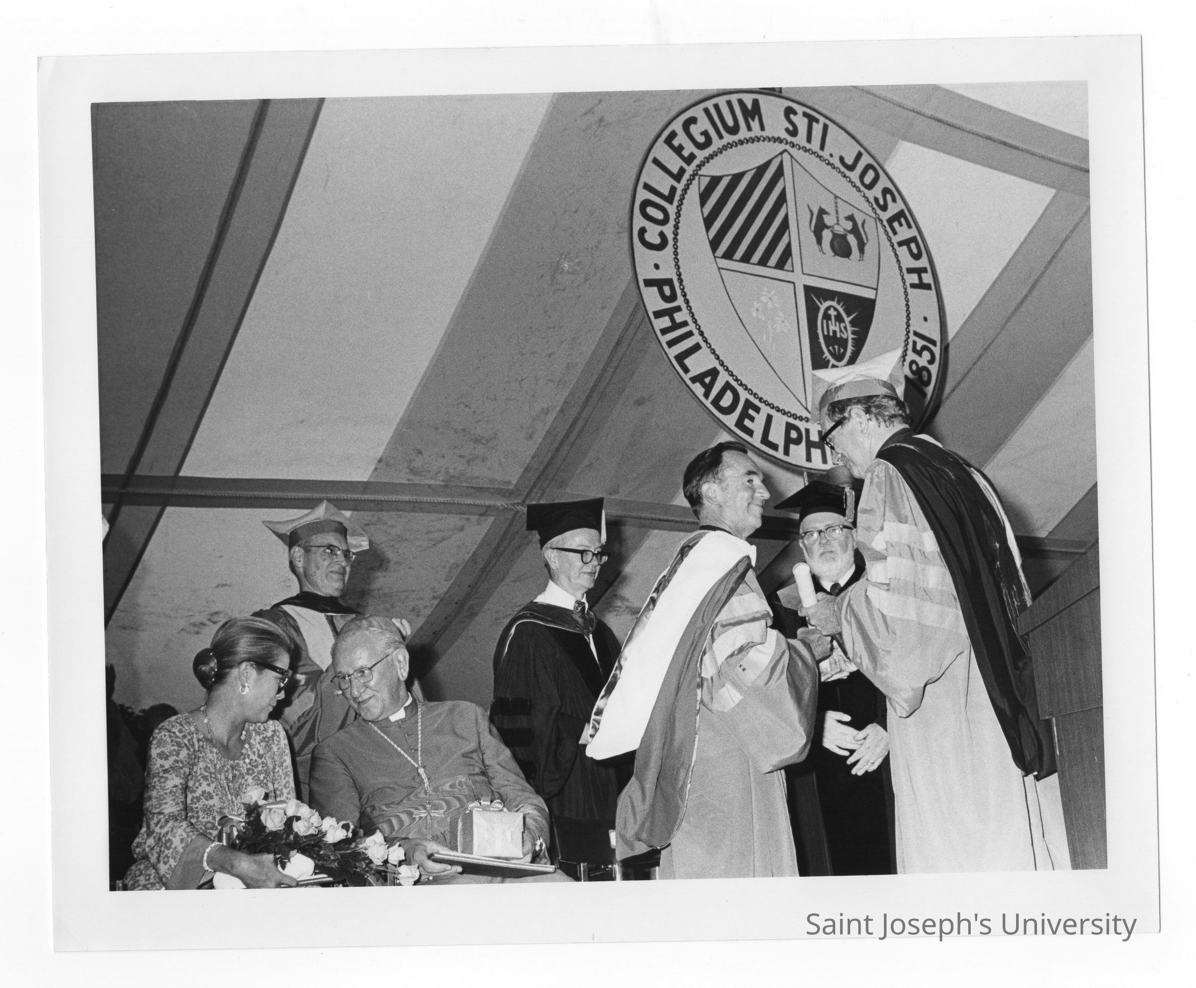 Terrence Toland, S.J.,receiving honorary degree during academic convocation held on Gest Lawn, July 31, 1976, as part of SJC 125th anniversary celebration.