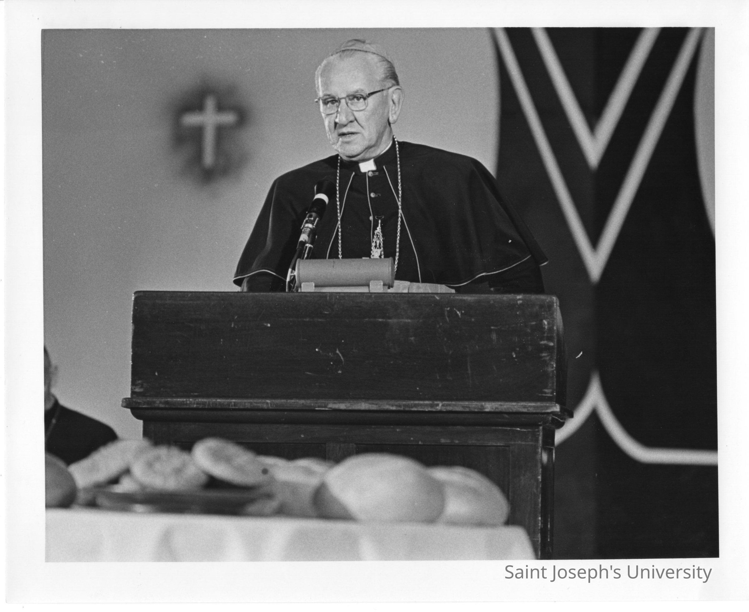 Cardinal John Krol giving address at International Eucharistic Congress, symposium on hunger, August 2, 1976, held at Philadelphia Civic Center.