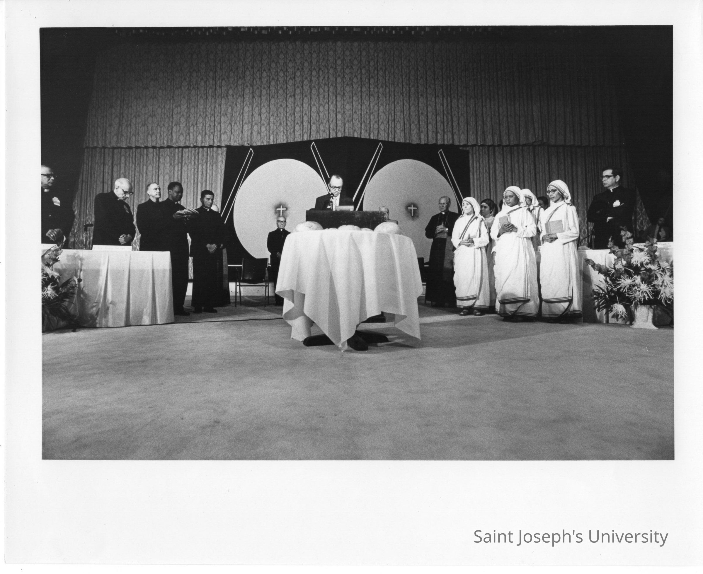 Dr. Thomas Melady introducing the bread breaking ceremony during International Eucharistic Congress, symposium on hunger, August 2, 1976, held at Philadelphia Civic Center.