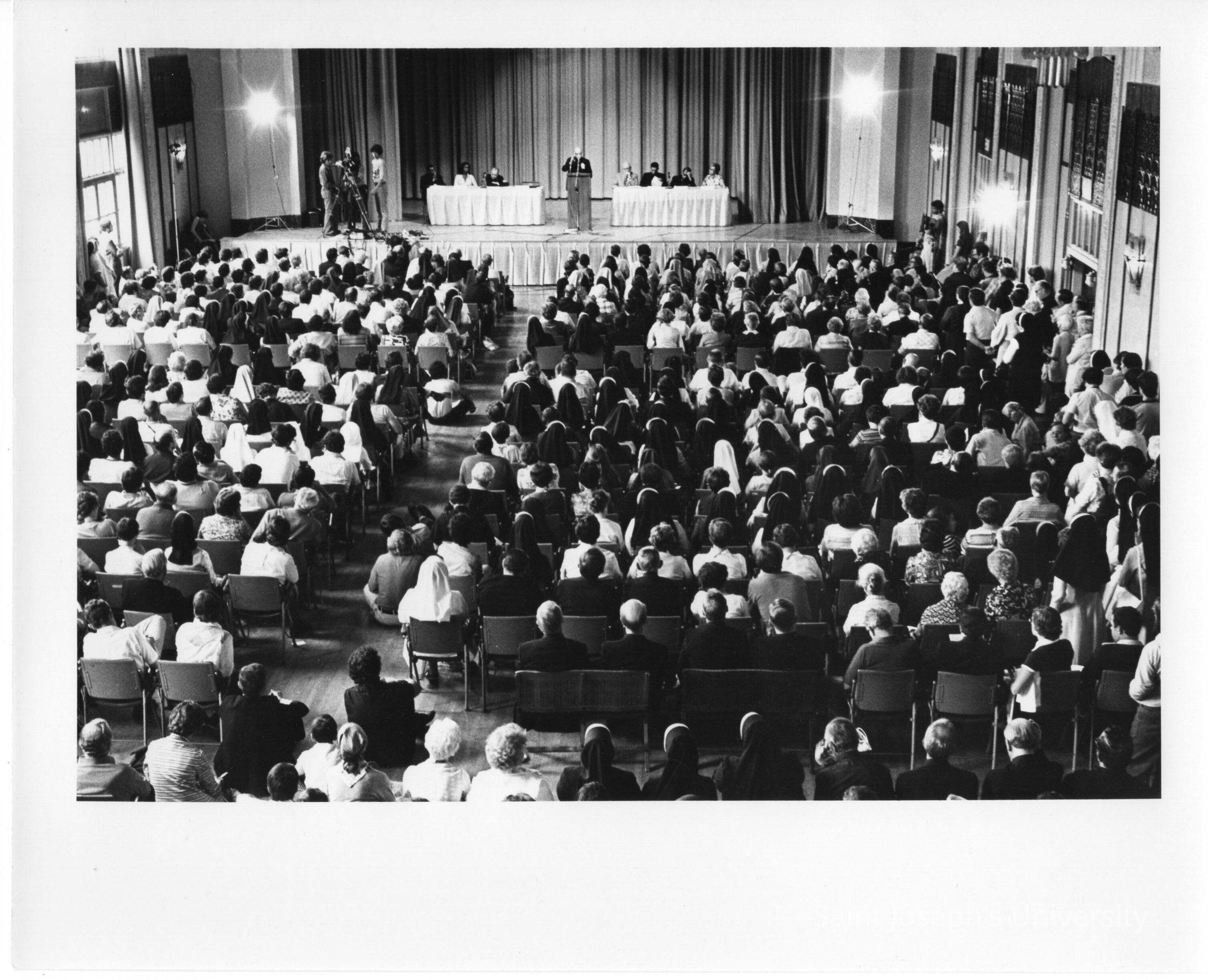 View of audience at panel presentation, "Hunger for Bread and Evangelization," at International Eucharistic Congress, symposium on hunger, August 2, 1976, held at Philadelphia Civic Center.