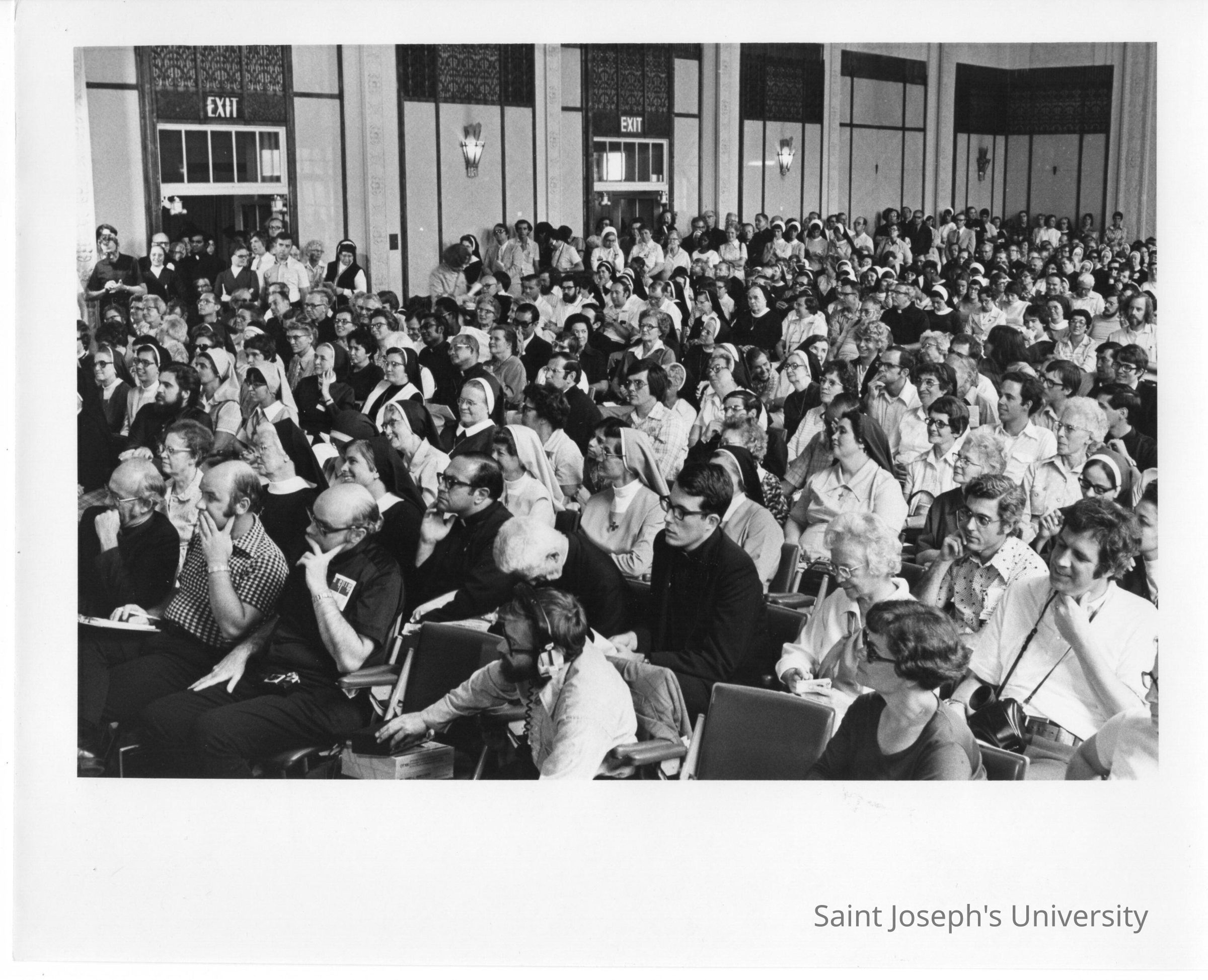 View of audience at panel presentation, "Hunger for Bread and Evangelization," at International Eucharistic Congress, symposium on hunger, August 2, 1976, held at Philadelphia Civic Center.