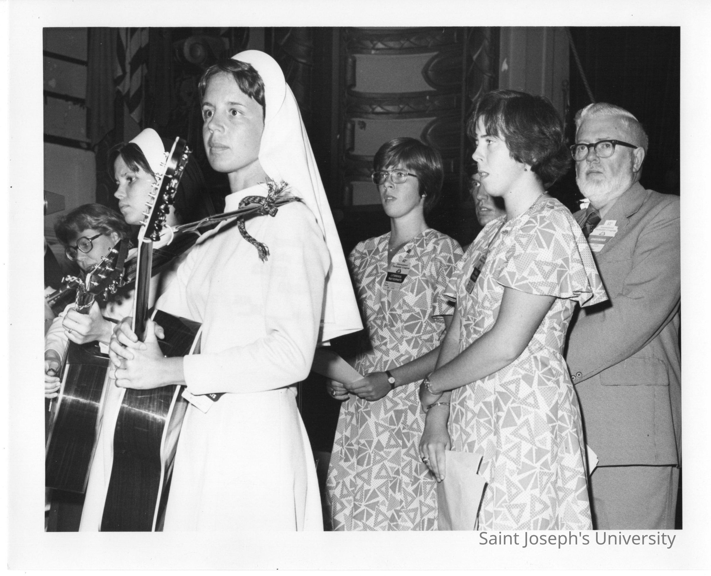 View of musicians and James E. Dougherty participating in International Eucharistic Congress, symposium on hunger, August 2, 1976, held at Philadelphia Civic Center.