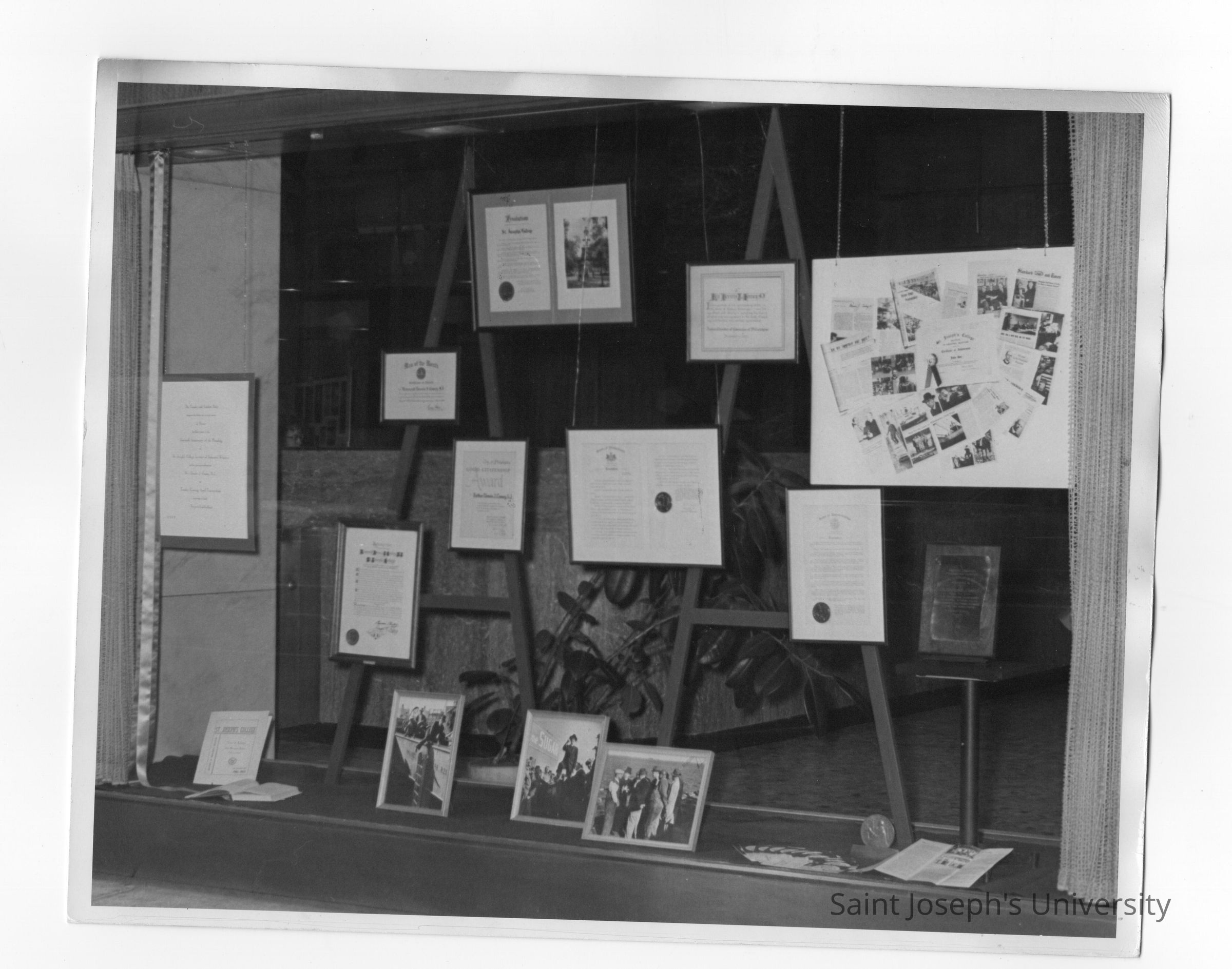 PNC (Phildadelphia National Bank) display of SJC memorabilia along with photographs of Dennis Comey, S.J. on the Philadelphia docks and waterfront.