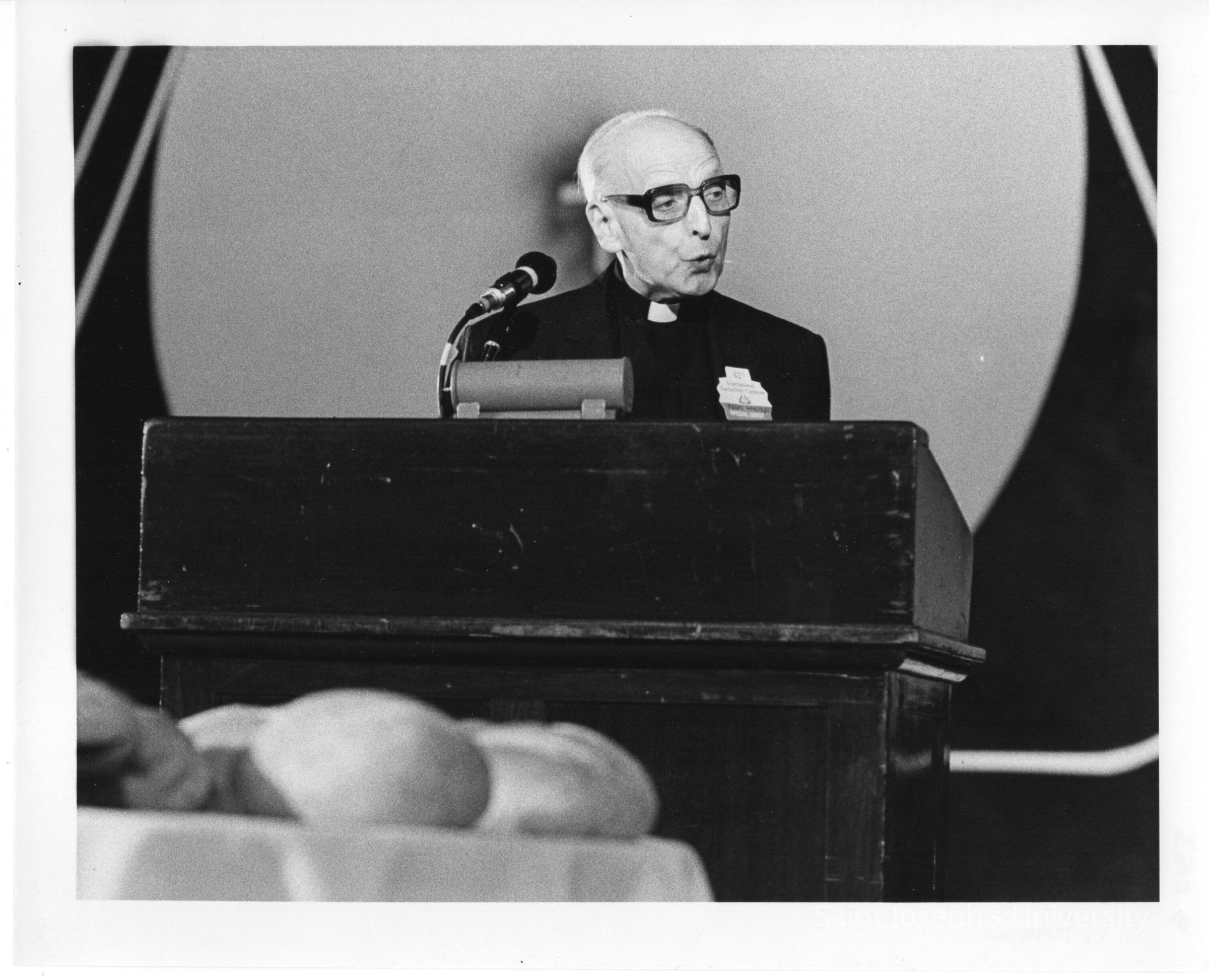 Rev. Pedro Arrupe, S.J., speaking as part of SJC 125th anniversary celebration, August 1976.