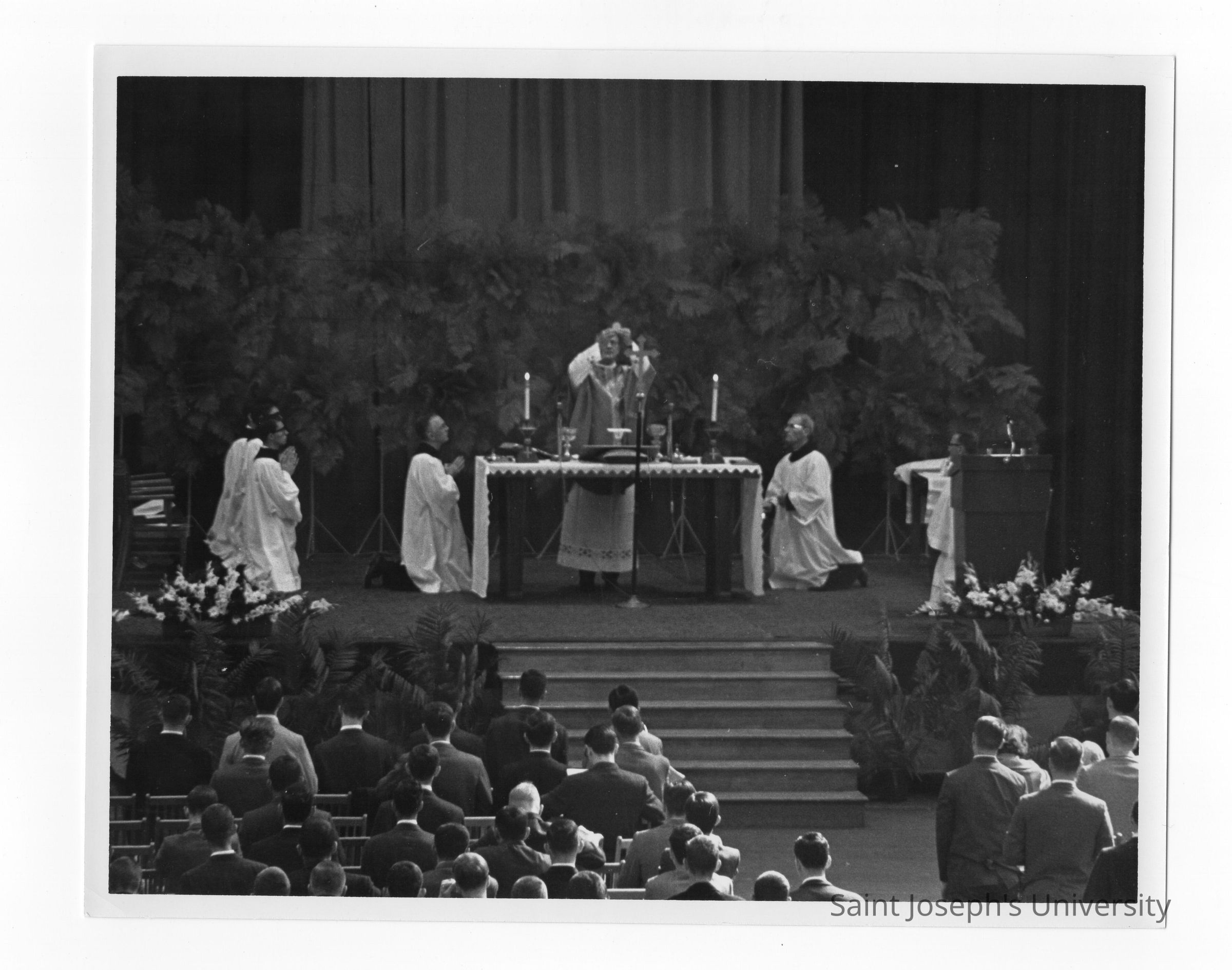 William F. Maloney, S.J., and others during Mass of the Holy Spirit in Field House, c. 1962.