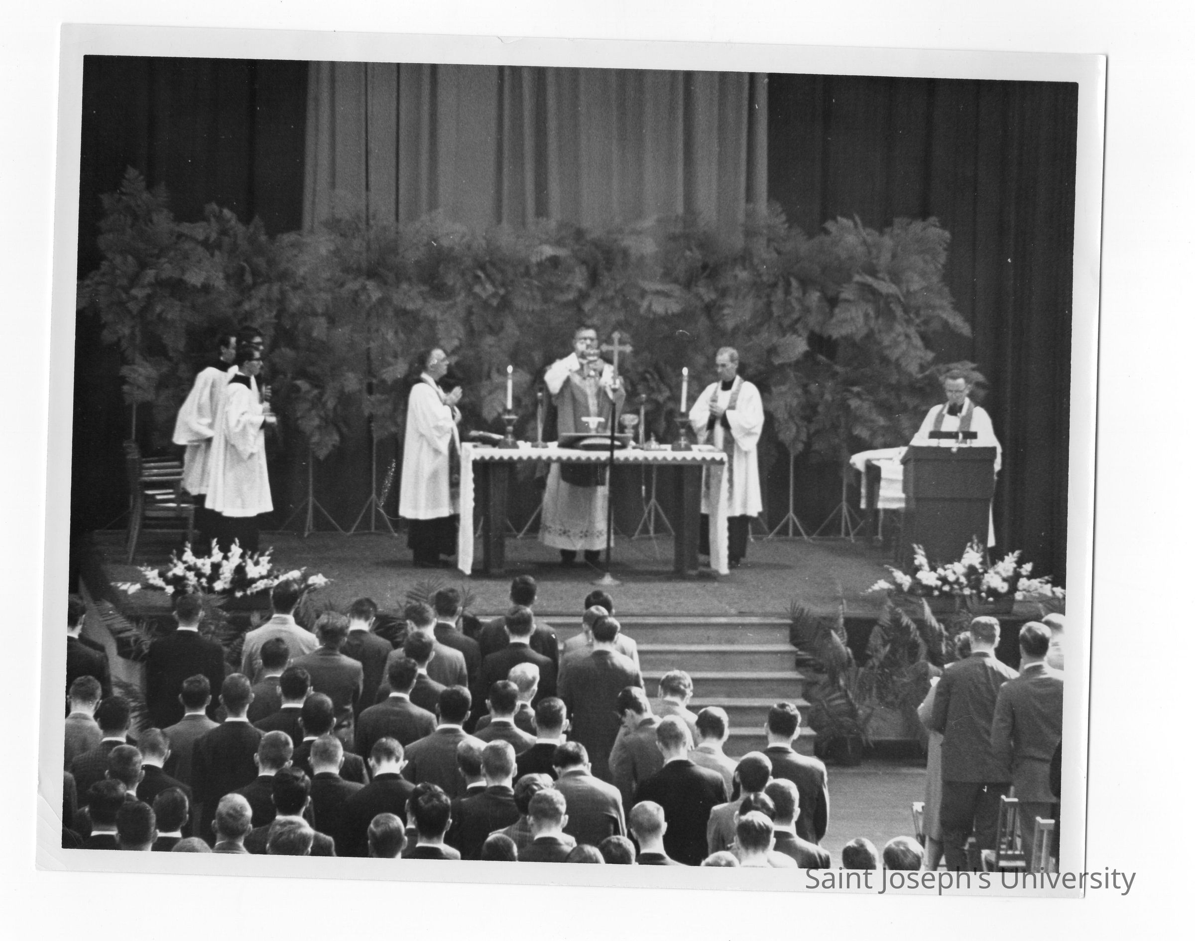 William F. Maloney, S.J., and others during Mass of the Holy Spirit in Field House, c. 1962.