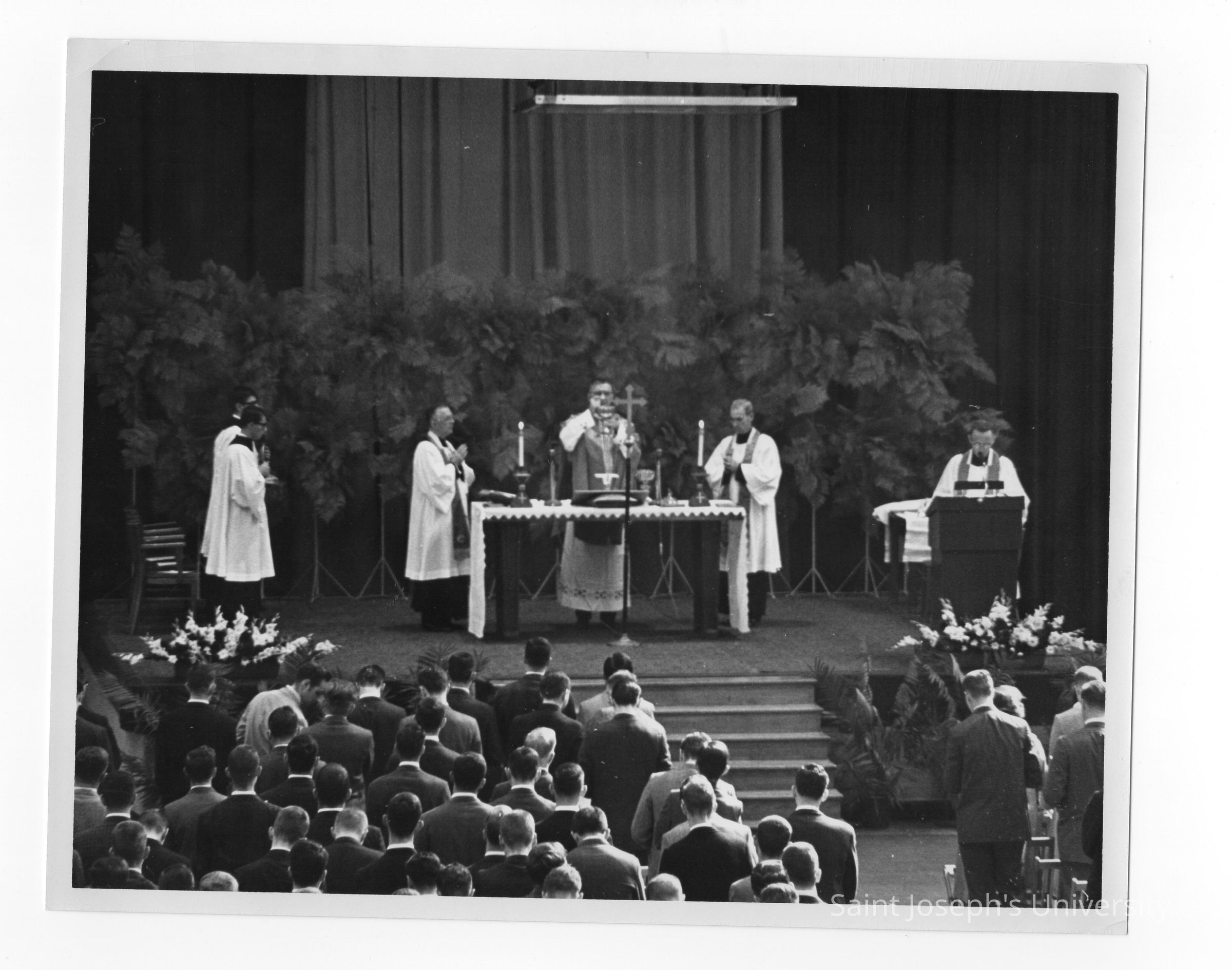 William F. Maloney, S.J., and others during Mass of the Holy Spirit in Field House, c. 1962.
