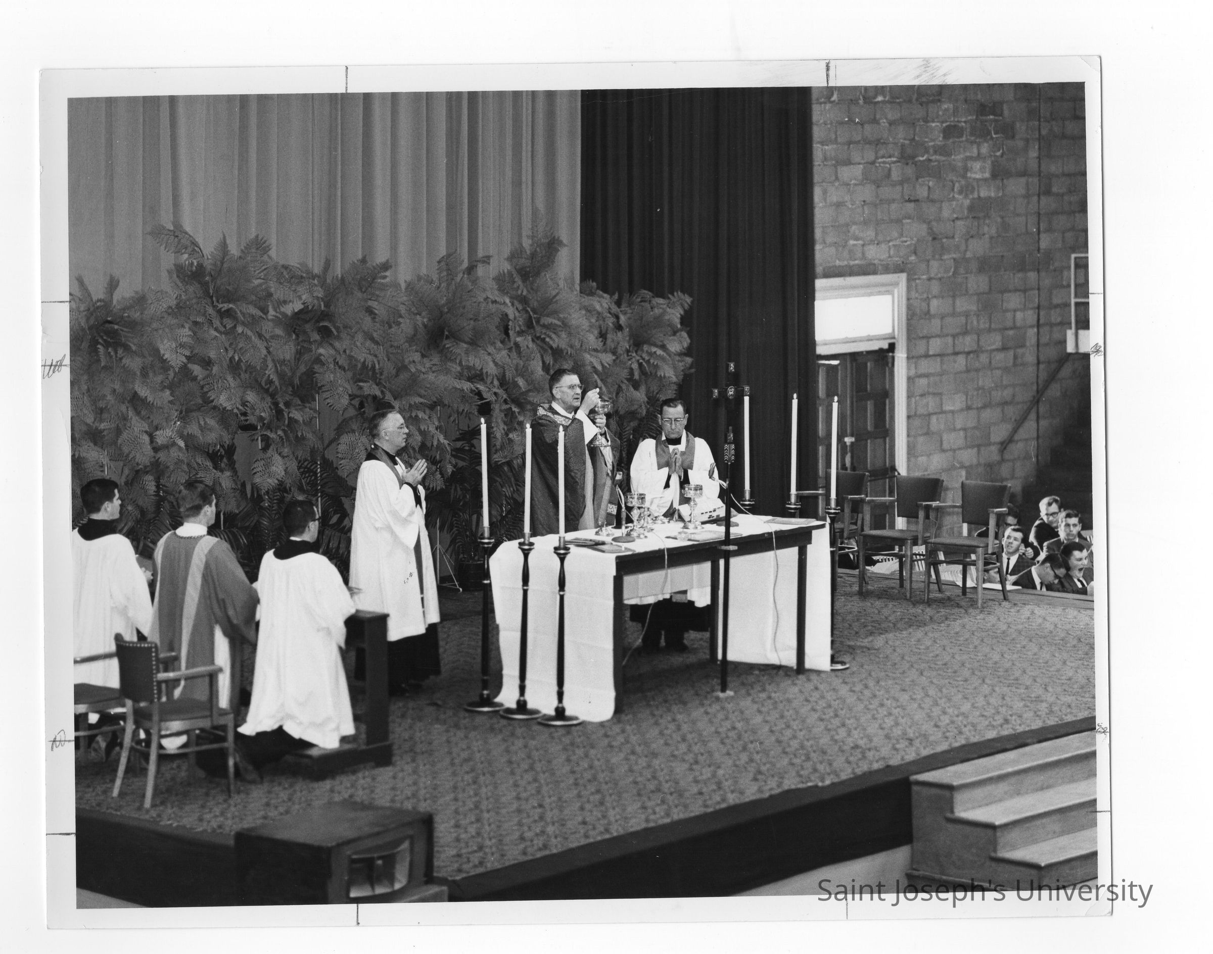 William F. Maloney at elevation of bread and wine during Mass of the Holy Spirit in Field House, October 8, 1963.