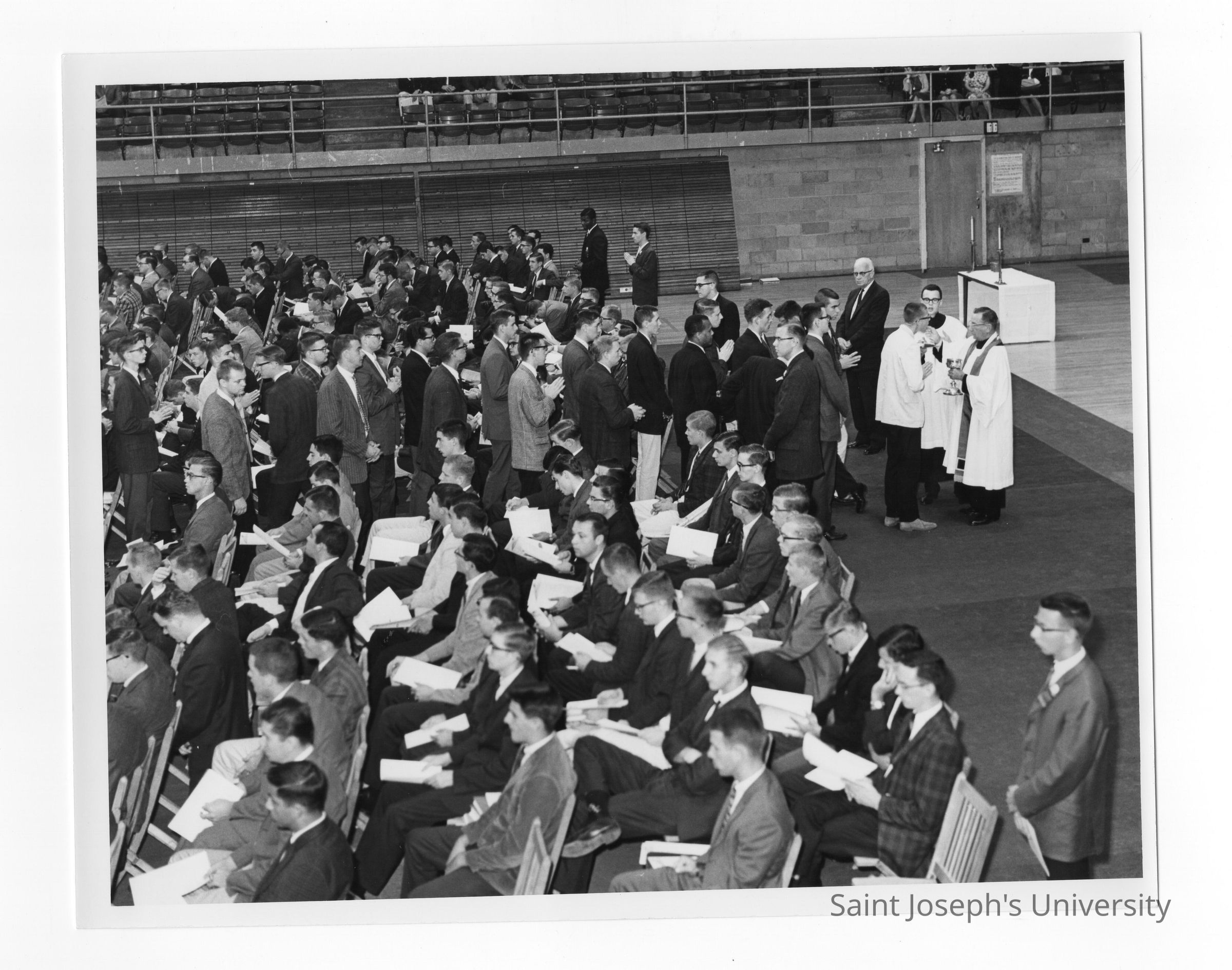 Students receiving communion during Mass of the Holy Spirit in Field House, October 8, 1963.