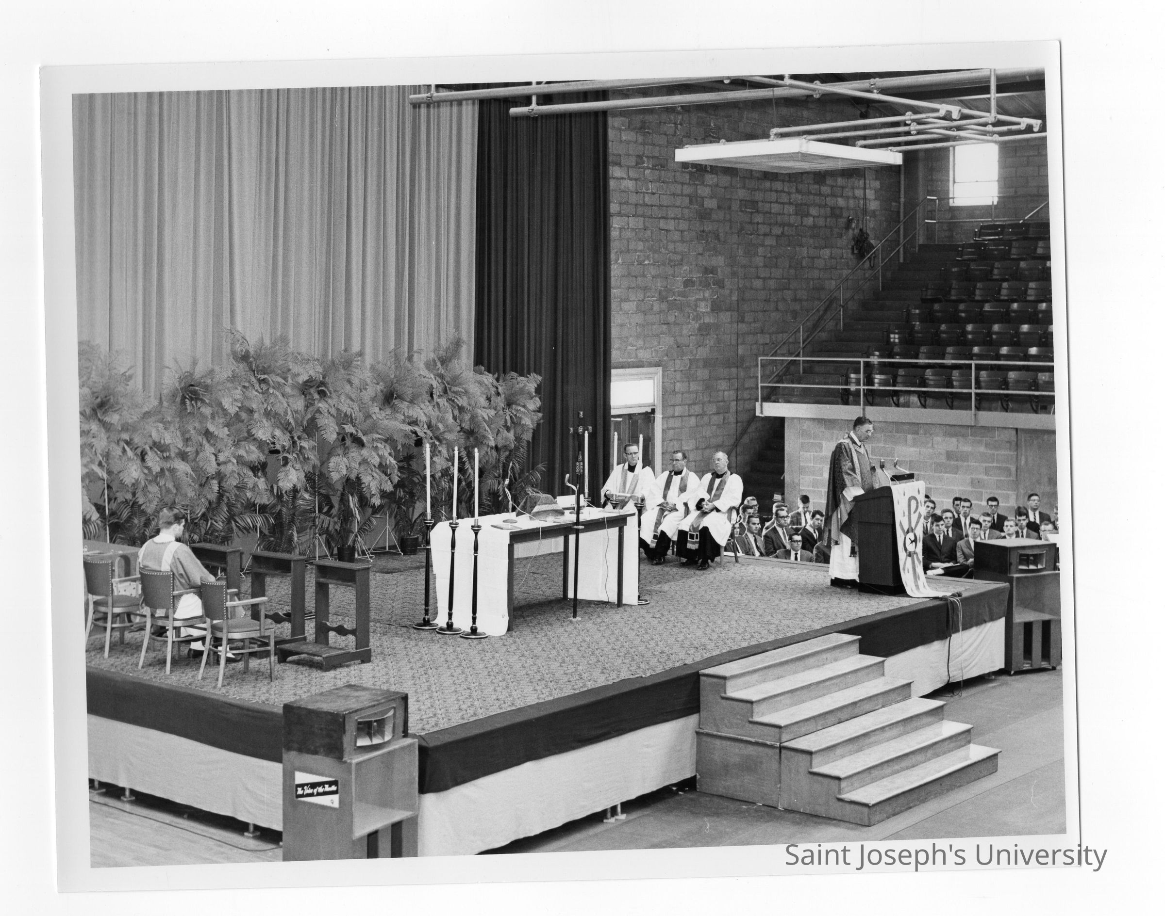 William F. Maloney, S.J., addressing students during Mass of the Holy Spirit in Field House, October 8, 1963.