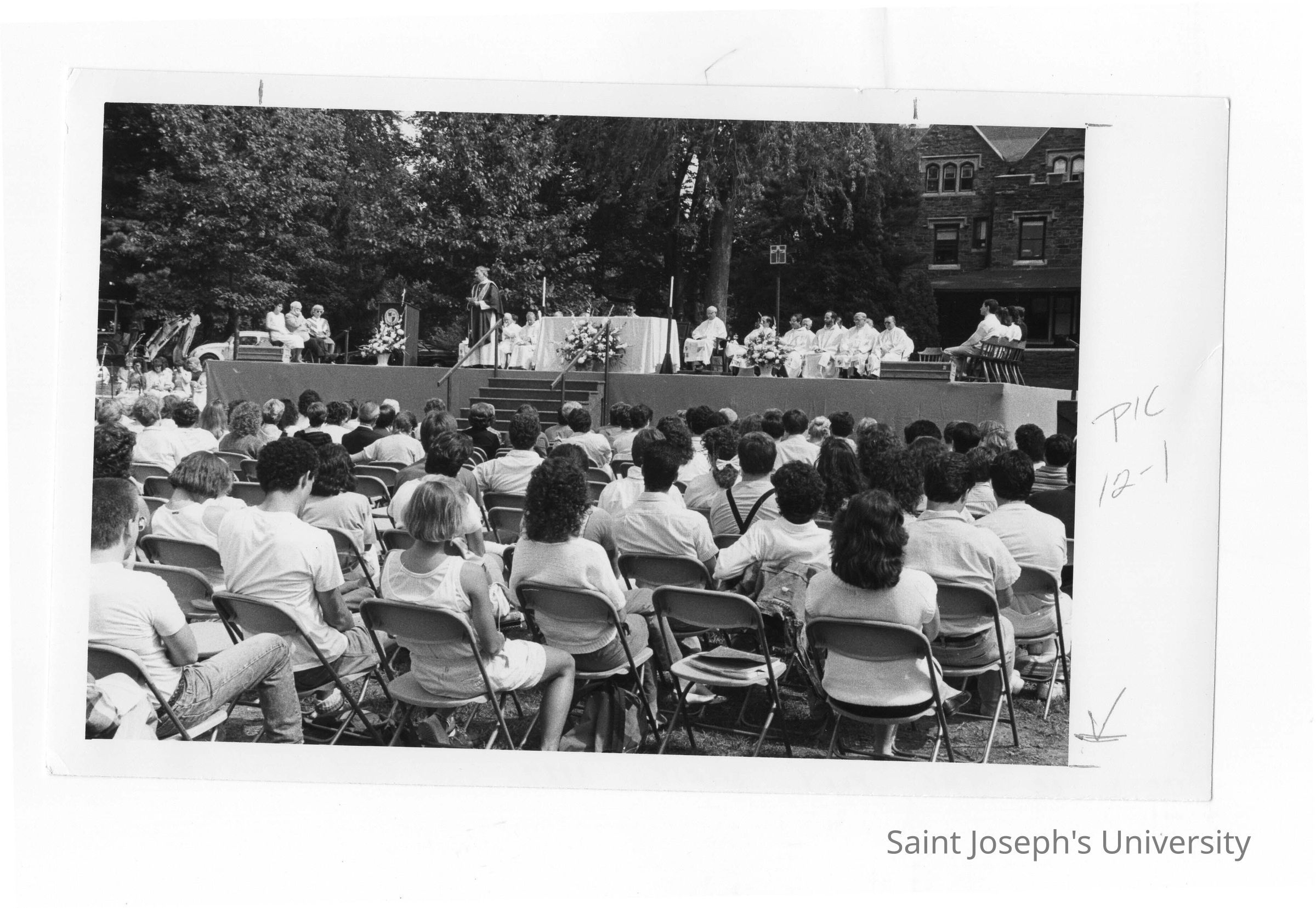 Nicholas S. Rashford, S.J., giving homily during Mass of the Holy Spirit held outside near Wolfington Hall, September 1987.