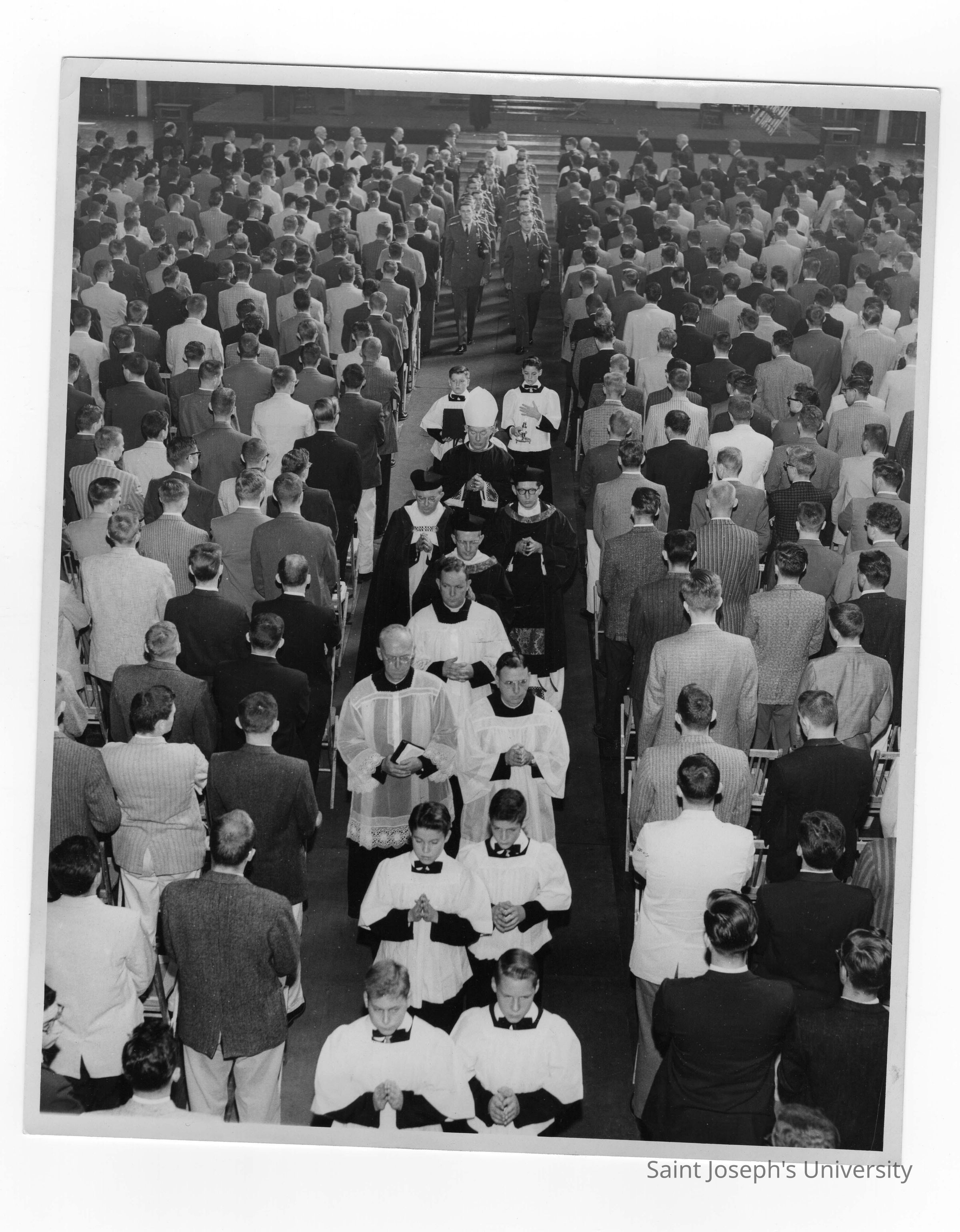 Recessional following Mass in Field House, c. 1957 with Bishop McSorley (?) and J. Joseph Bluett, S.J.