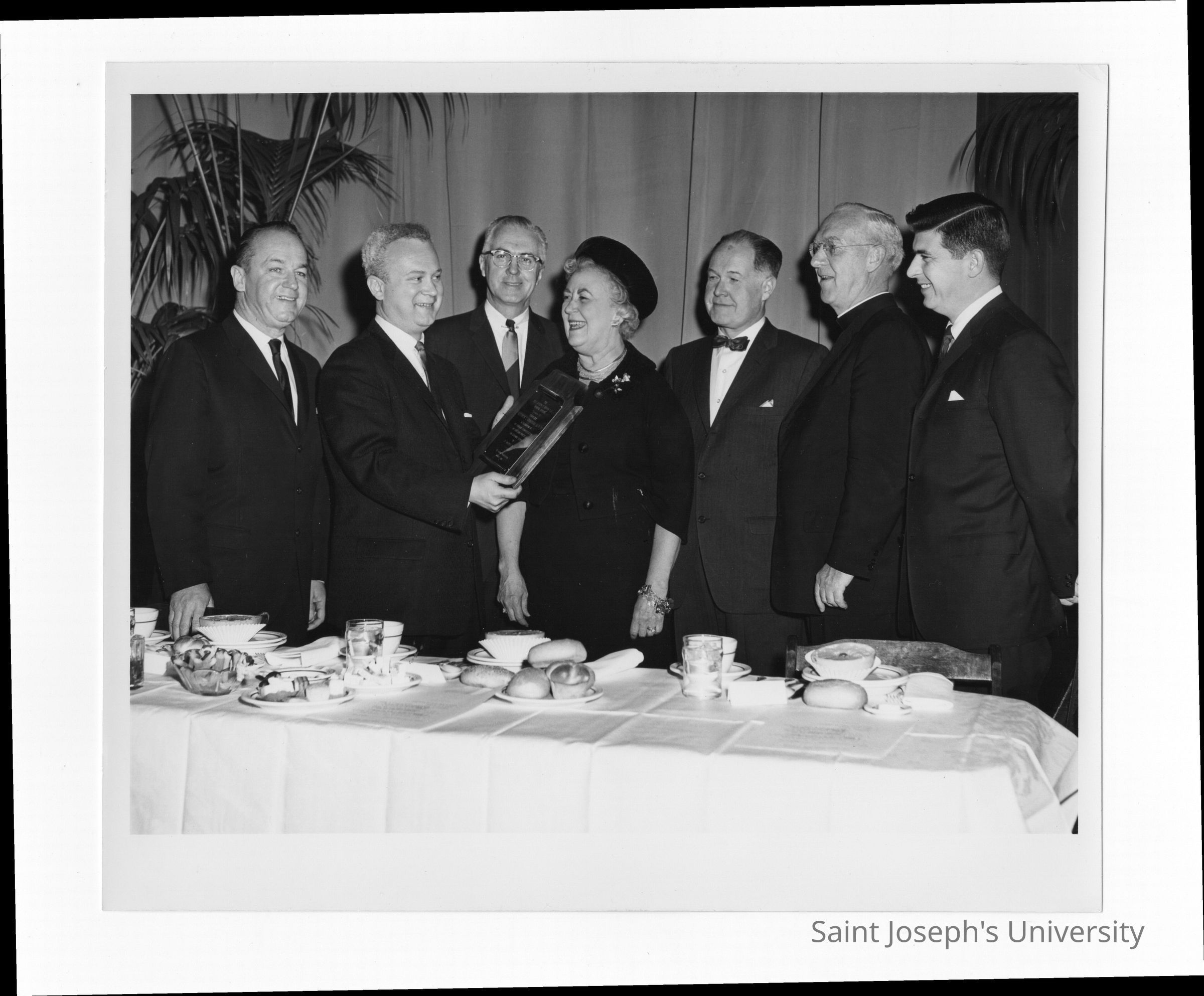 Kathryn Granahan receiving Hogan Alumni Award, March 7,1962 with J. Joseph Bluett, S.J., Mayor James Tate, Governor Bill Cahill, Frank Duff, Bill Berloch watching.