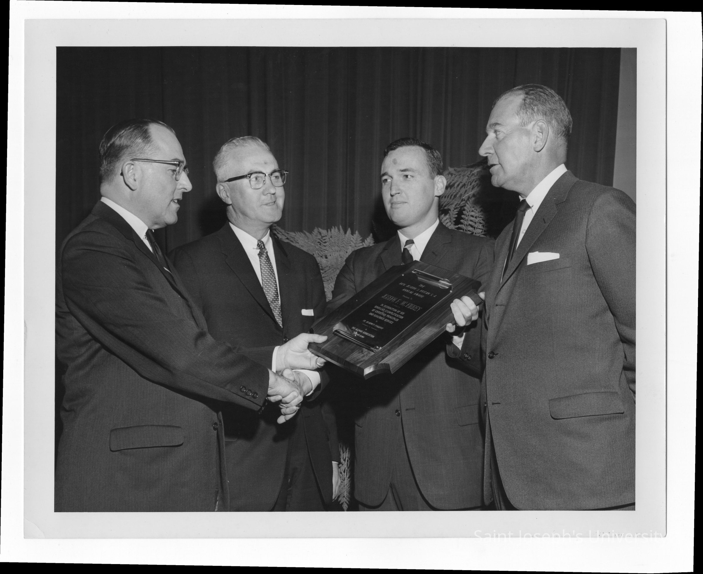 Joseph F. McKinney receiving Hogan Alumni Award with John Clark, Mayor James Tate, and William F. Kelly watching, February 27, 1963.