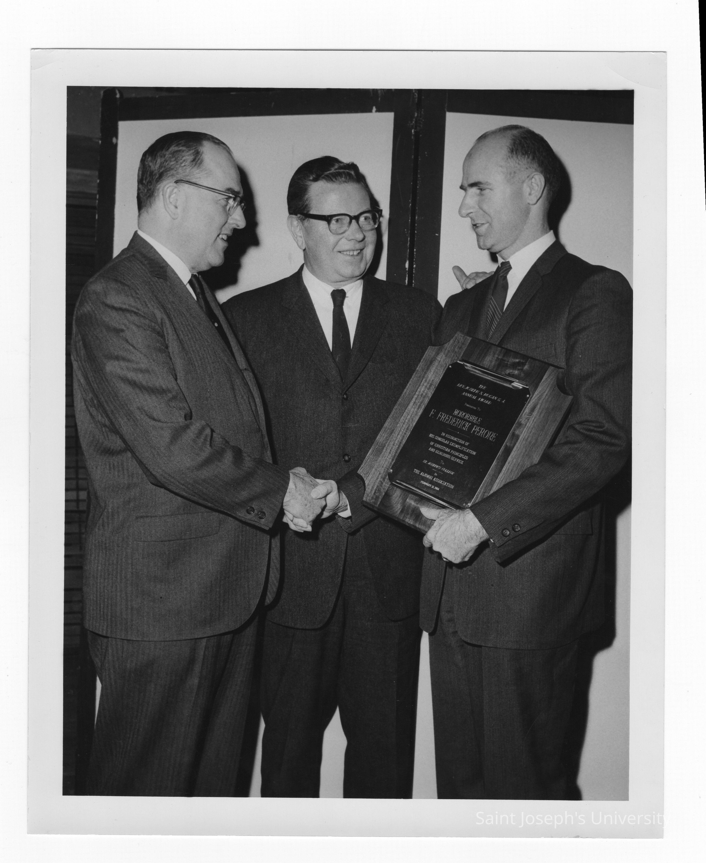 F. Frederick Perone holding Hogan Alumni Award plaque with John P. Clark and Governor Richard J. Hughes watching, February 12, 1964.