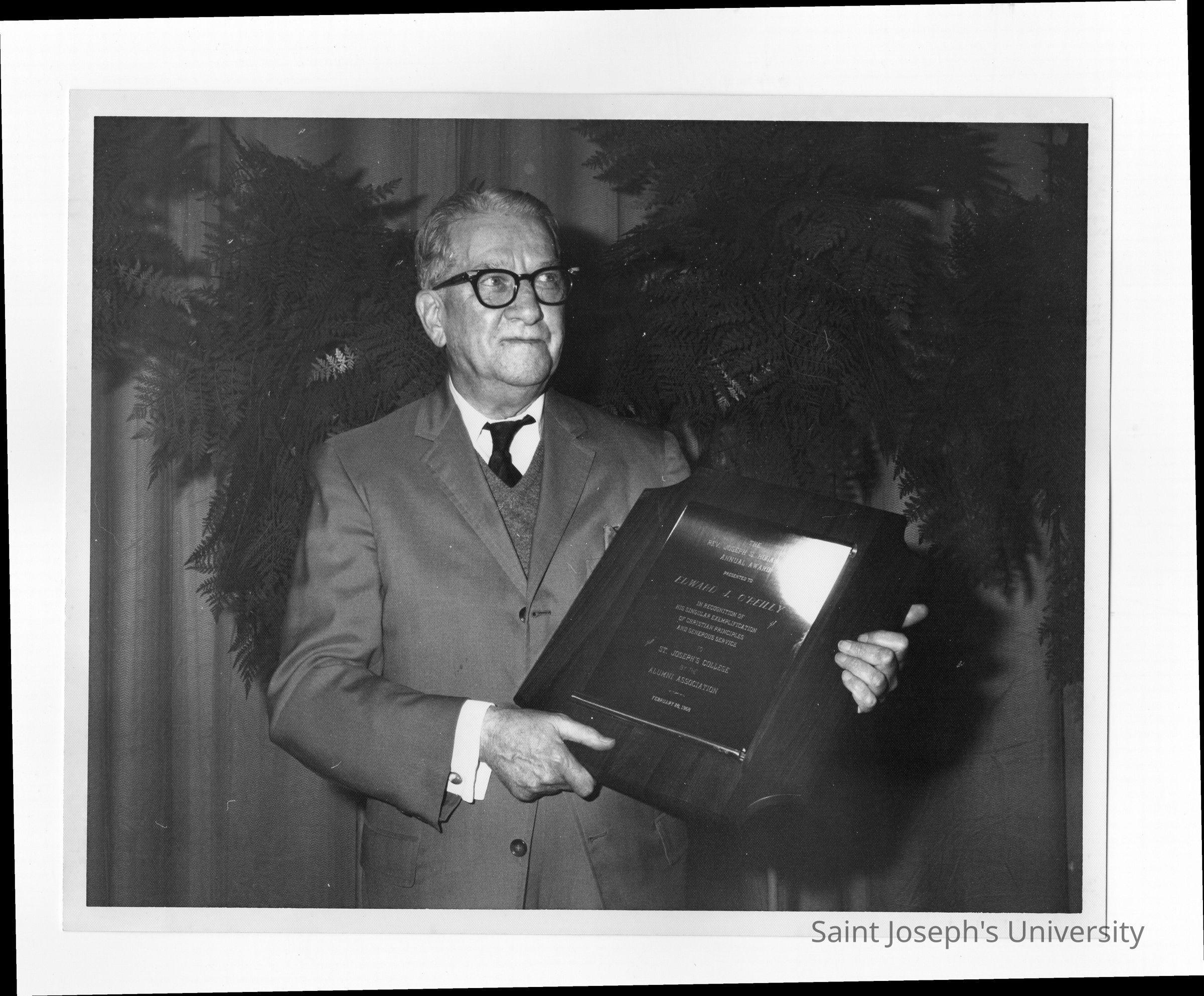 Edward J. O'Reilly holding Hogan Alumni Award plaque, February 1968.