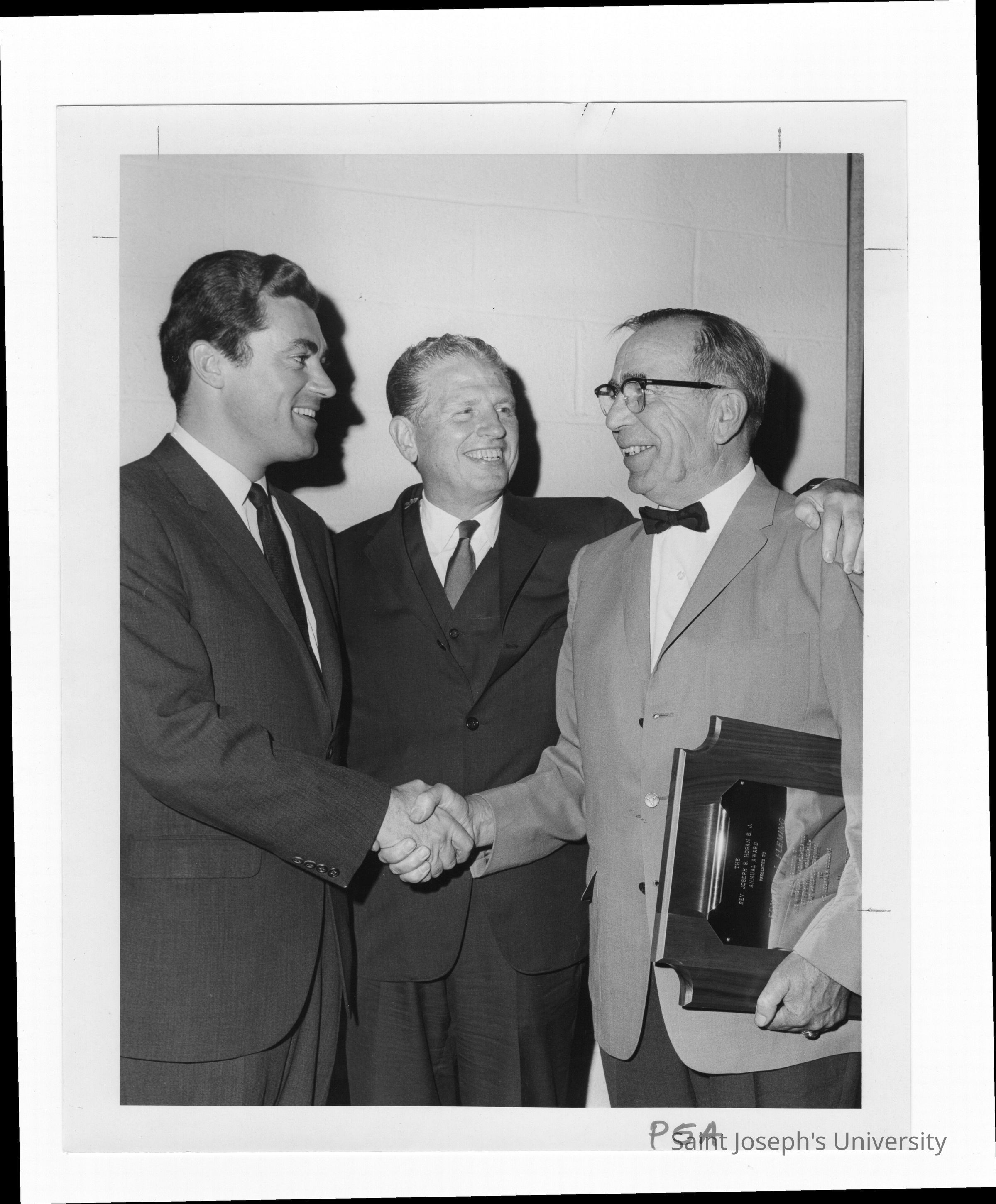 Edward J. Fleming receiving Hogan Alumni Award with Congressman William J. Green, III, and Lieutenant Governor Broderick watching, May 16, 1969.