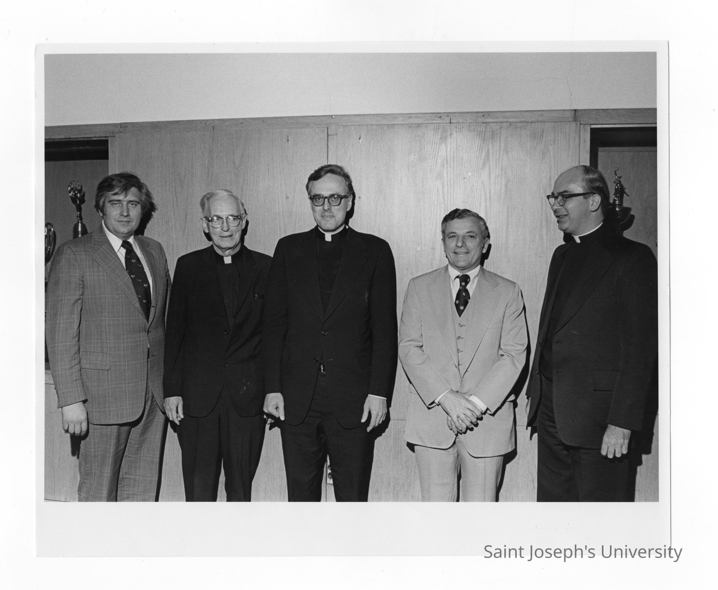 Hogan Alumni Award winner Francis J. Emory, S.J., standing with Donald I. MacLean, S.J., and others, February 23, 1977.
