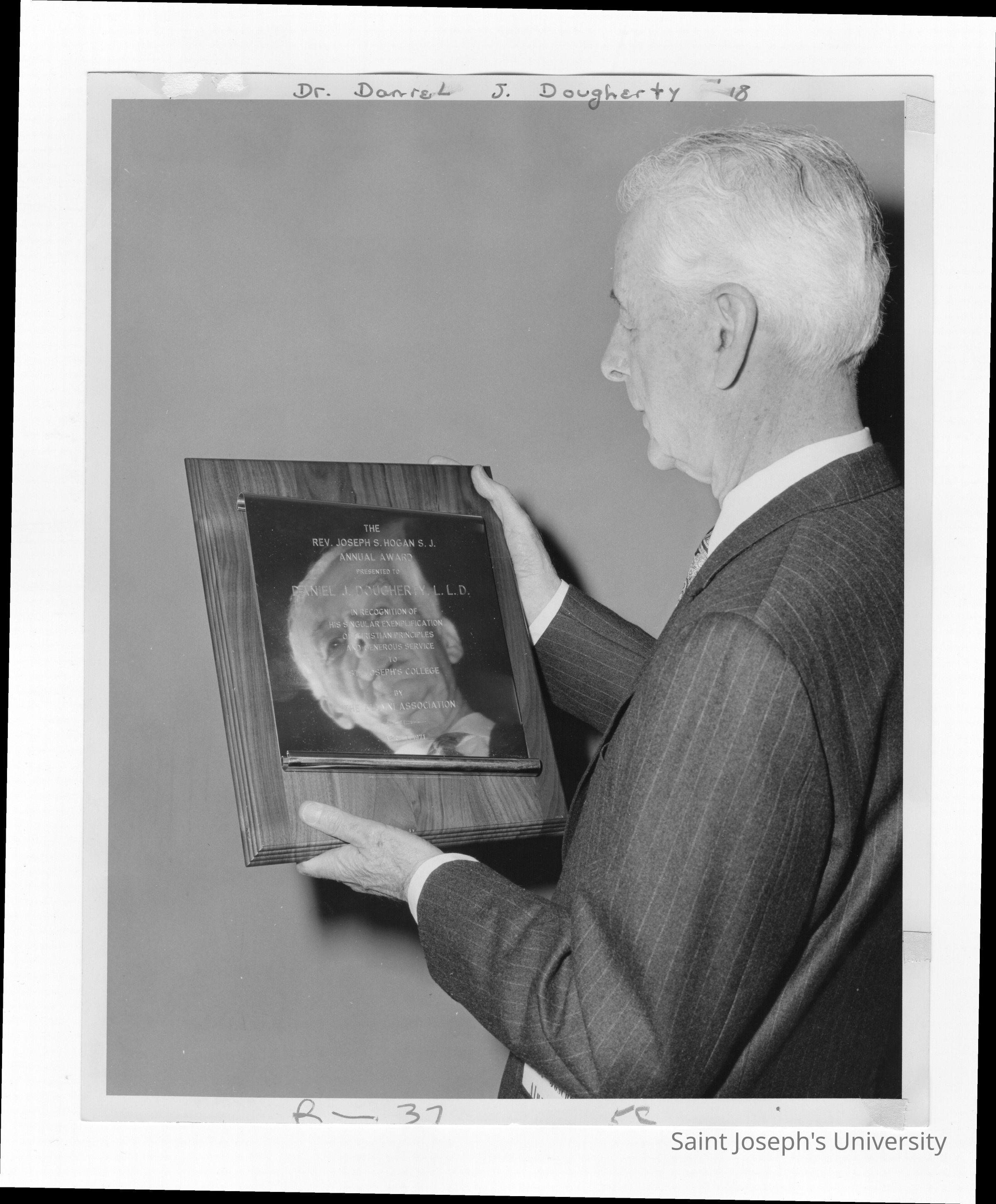 Dr. Daniel Dougherty, recipient of 1971 Hogan Alumni Award, holding plaque.