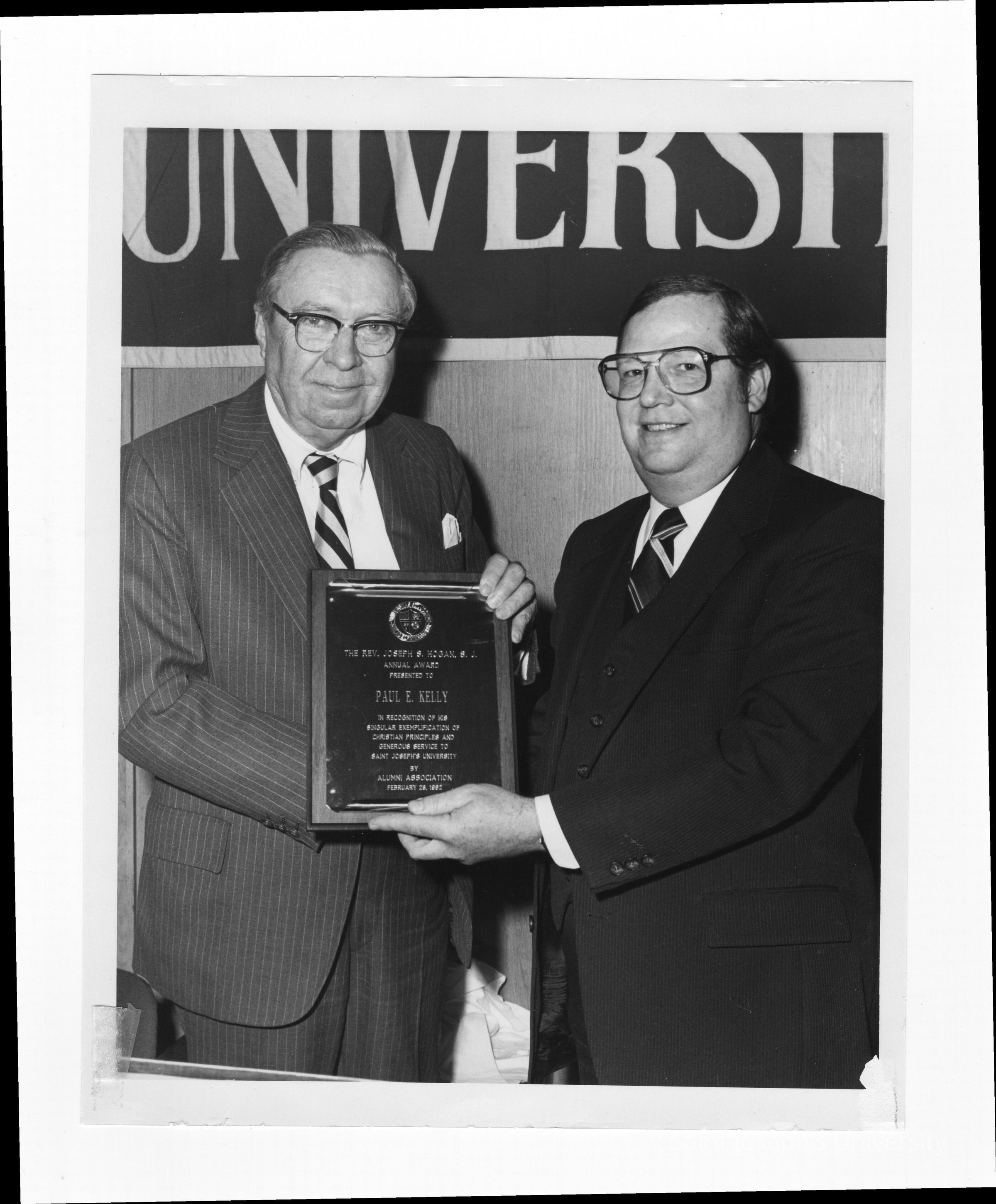 Paul E. Kelly, 1982 Hogan Alumni Award recipient, with Francis E. Wellock.