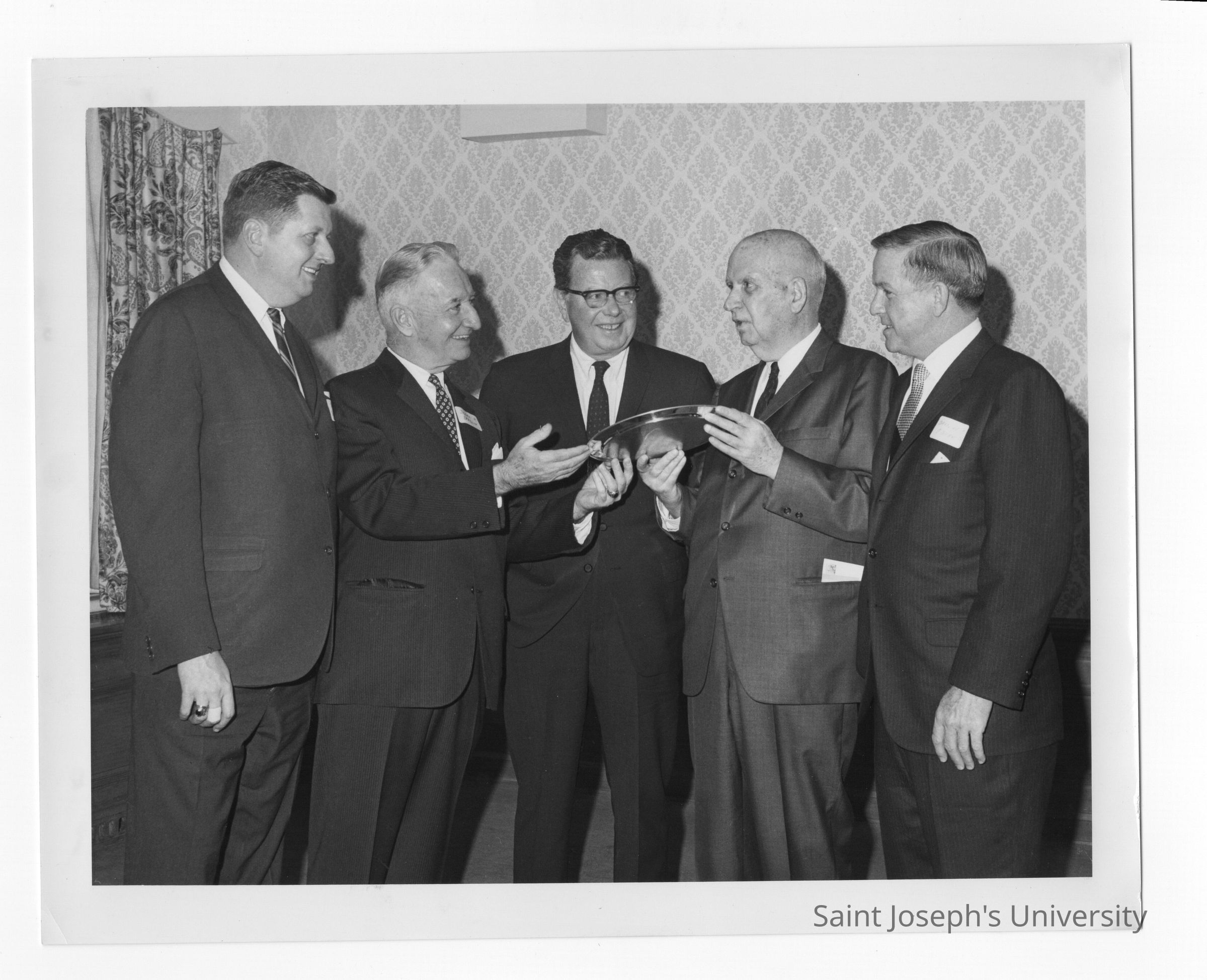 Charles A. Waters holding Law Alumni Award with others watching, November 28, 1967.