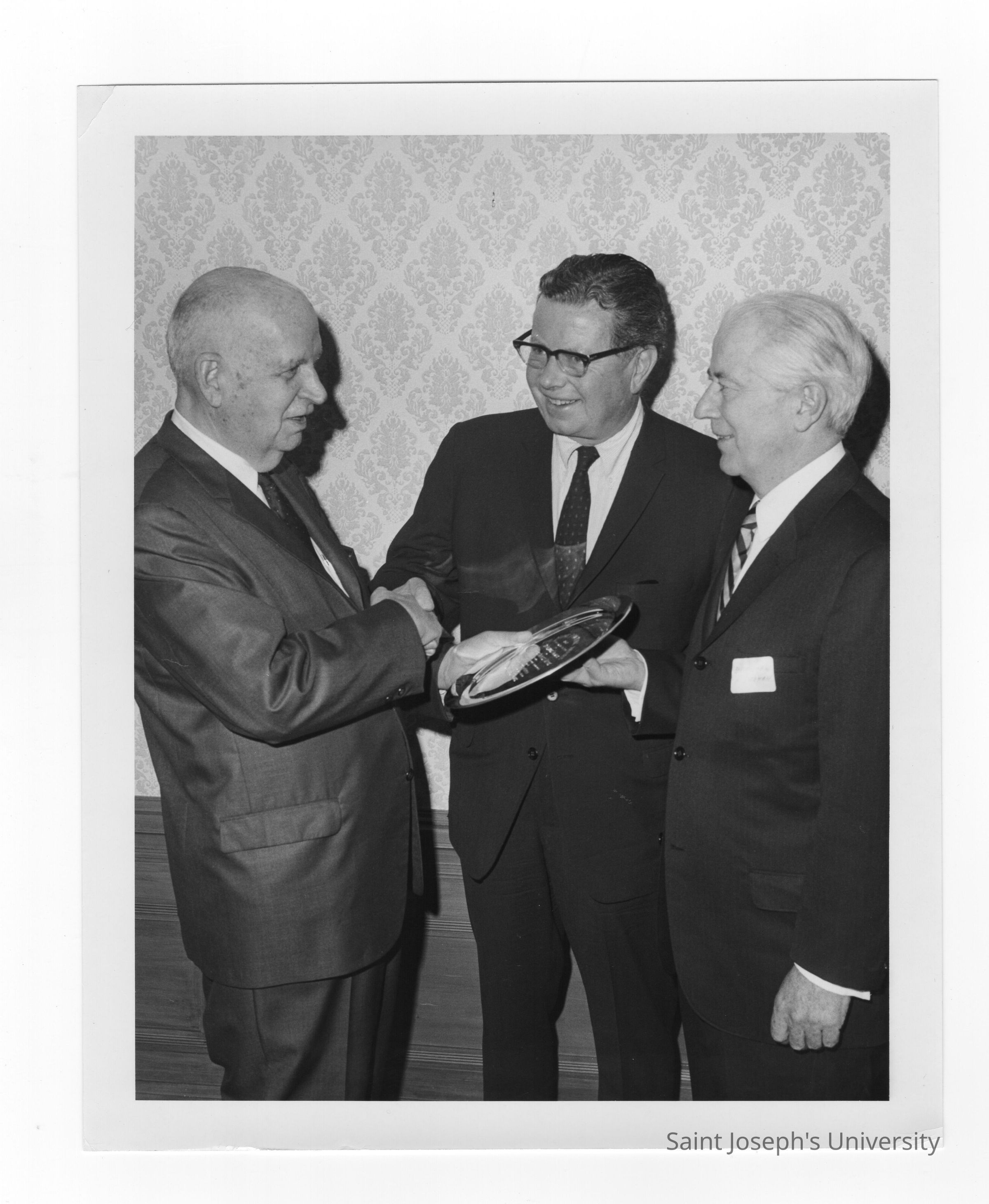 Charles A. Waters holding Law Alumni Award with others watching, November 28, 1967.