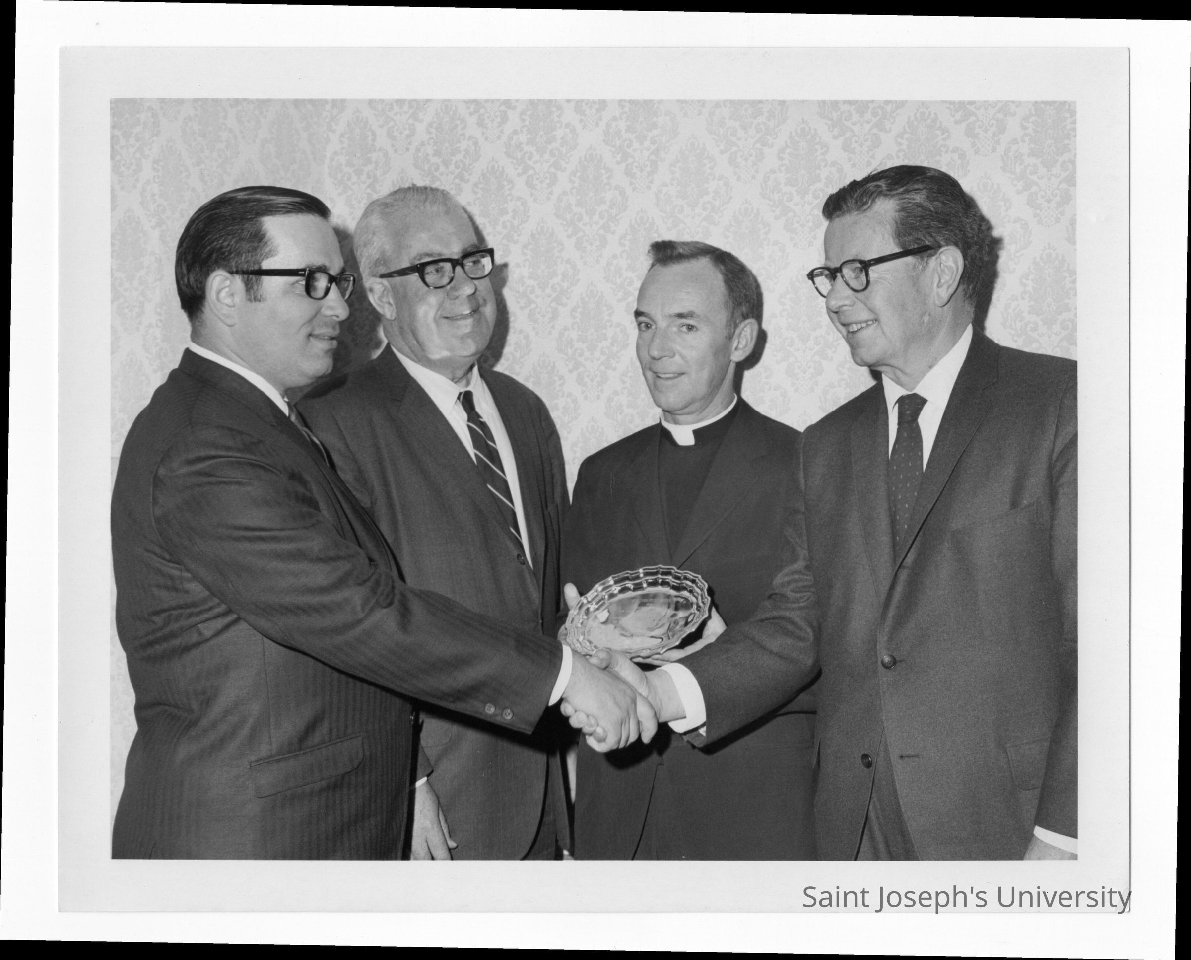 Richard J. Hughes receiving Law Alumni Award with Terrence Toland, S.J., and others watching, December 2, 1969.