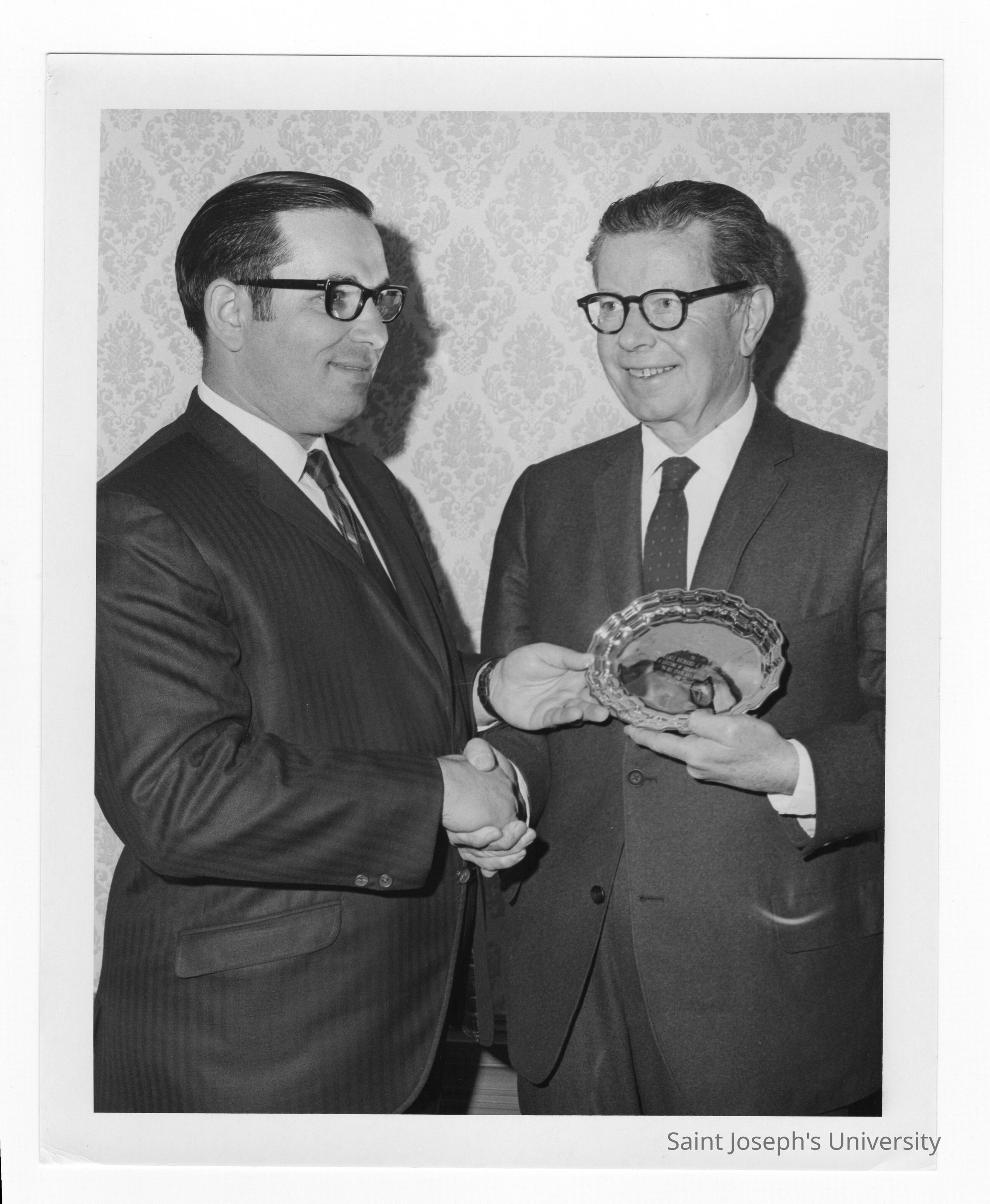 Richard J. Hughes receiving Law Alumni Award with another individual watching, December 2, 1969.
