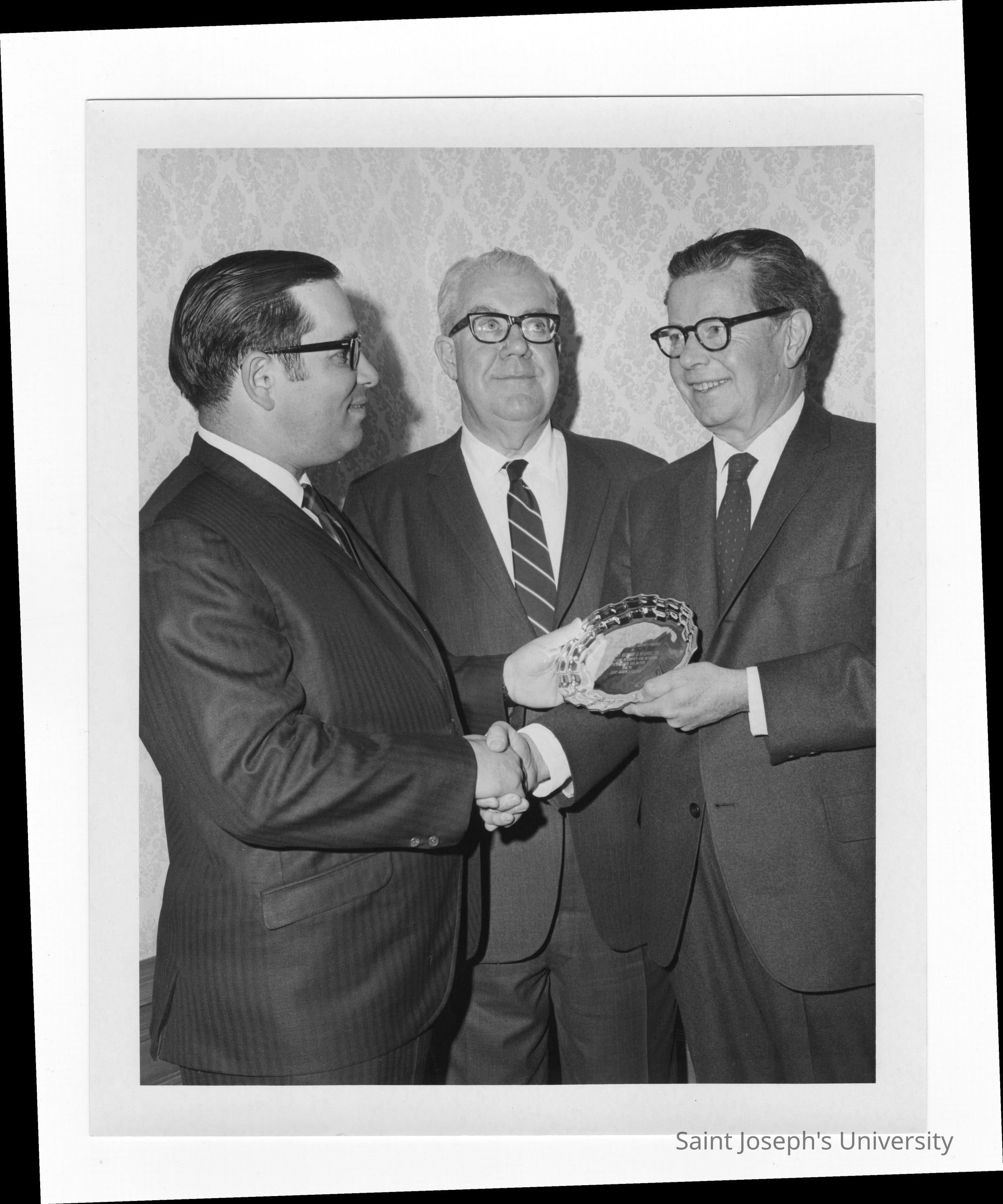 Richard J. Hughes receiving Law Alumni Award with two other individuals watching, December 2, 1969.