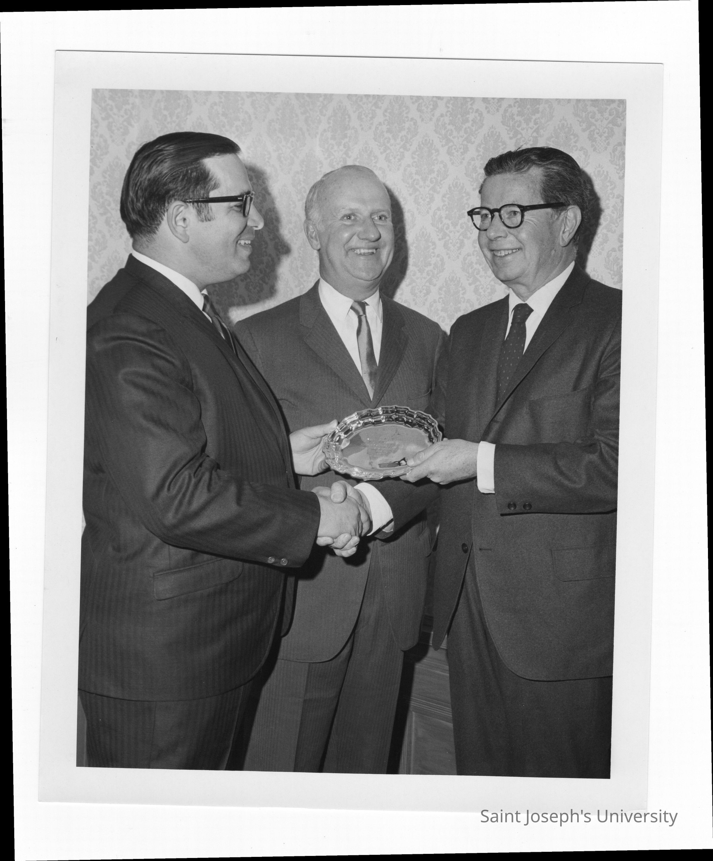Richard J. Hughes receiving Law Alumni Award with two other individuals watching, December 2, 1969.