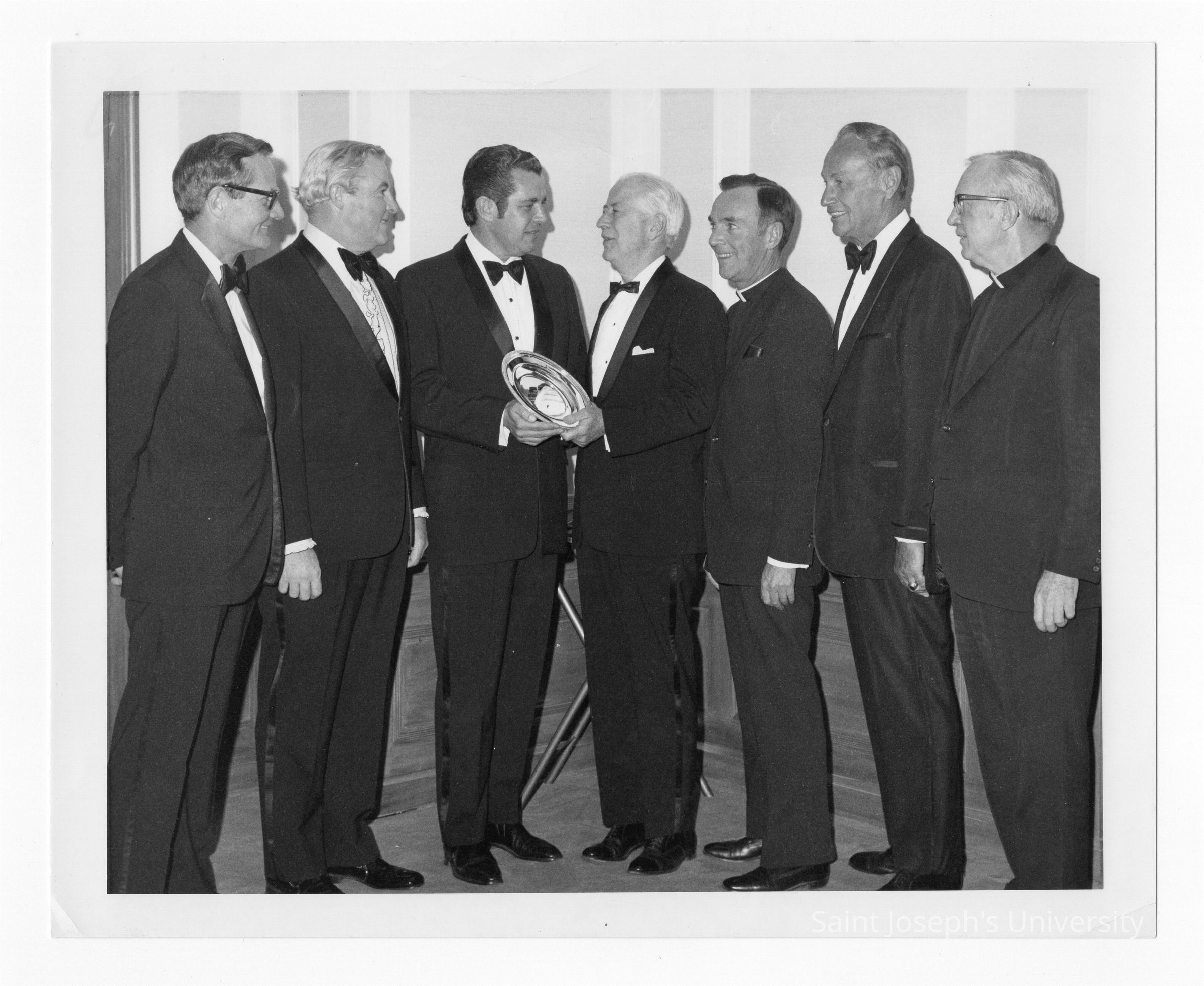 Terrence Toland, S.J. and others with Bartholomew A. Sheehan, S.J., recipient of Francis X. McClanaghan Award (formerly Nunc Pro Tunc Award) at Law Alumni dinner, November 29, 1973.