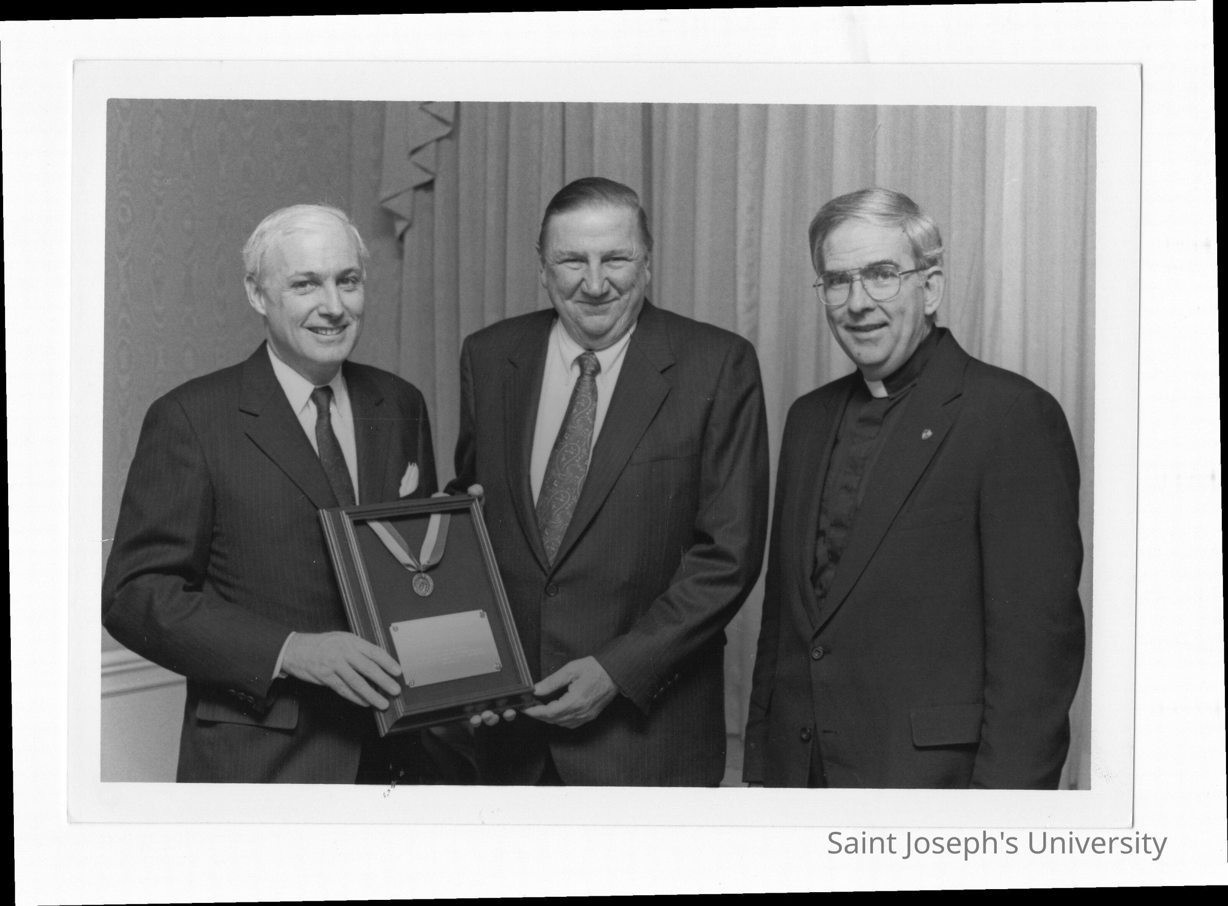 Nicholas S. Rashford, S.J.,with Bernard A. Scally, III, recipient of Bartholomew A. Sheehan, S.J. Award (formerly Crim-Gray Award) at Law Alumni dinner, September 10, 1987.