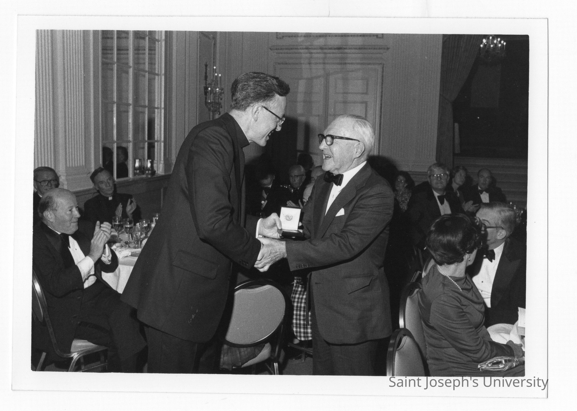 Donald I. MacLean, S.J., presenting award to Francis deSales Stokes, M.D., at alumni awards dinner, c. 1980.