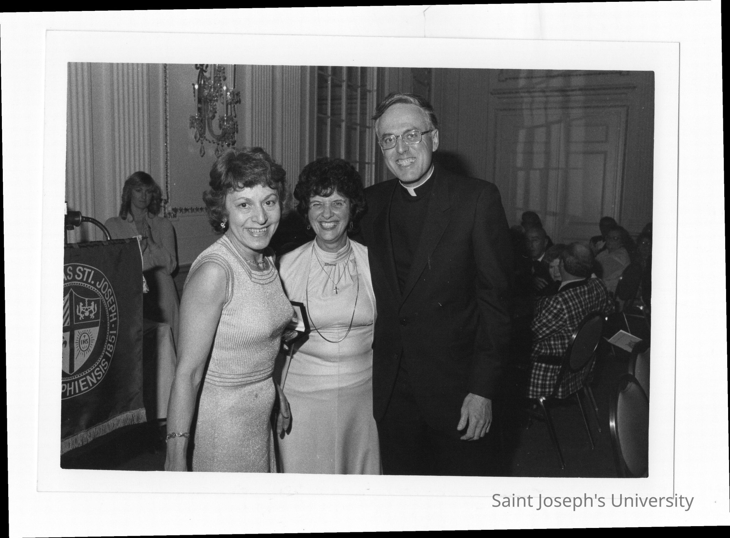 Donald I. MacLean, S.J.,with Teresa Scaperotto of the Bellarmine Guild and another individual at alumni awards dinner, c. 1980.