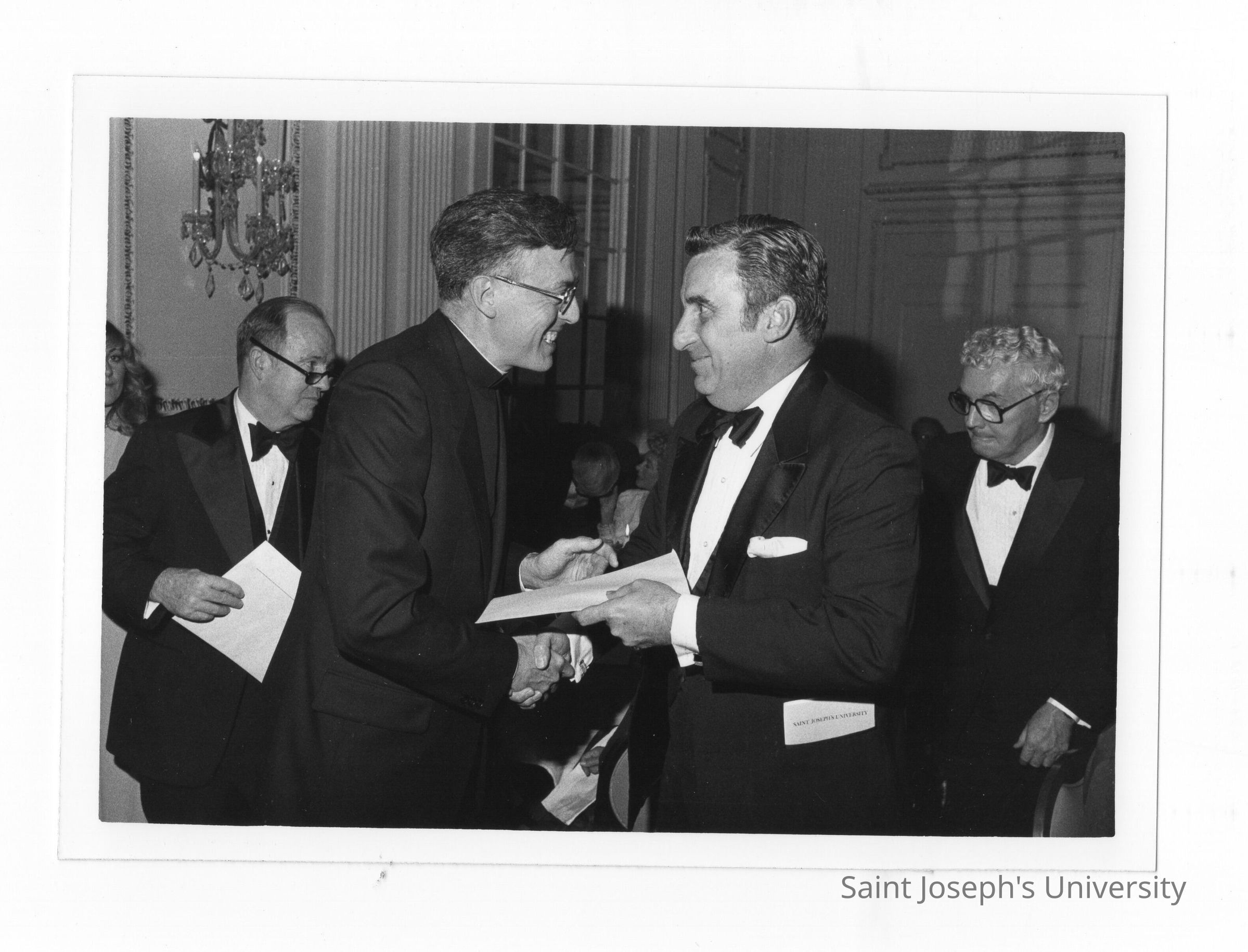 Donald I. MacLean, S.J., handing awards to Cornelius O'Brien, Daniel J. Henry, John J. Meehan, M.D., during alumni awards dinner, c. 1980.