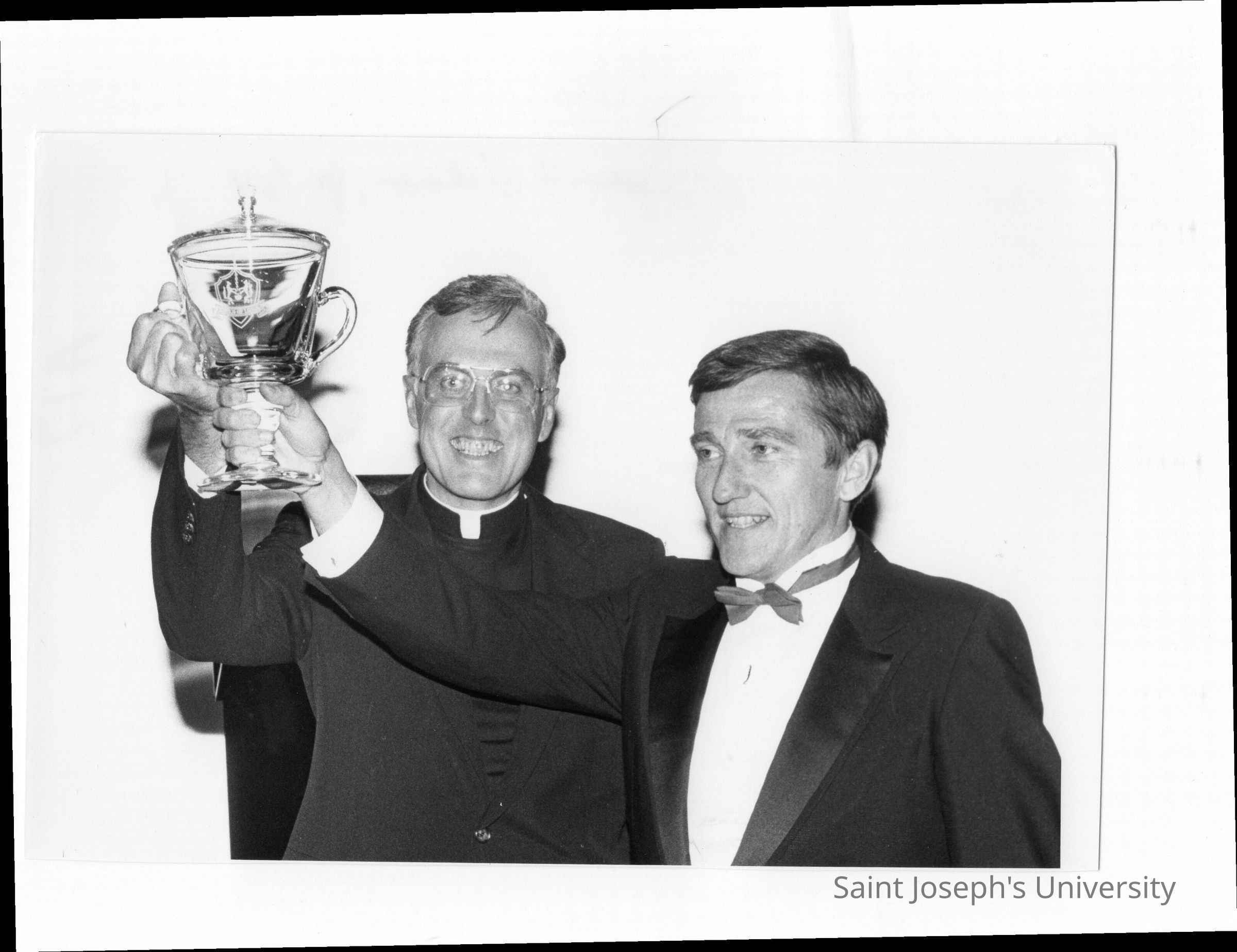 Donald I. MacLean, S.J., with John F. Lehman, Jr., recipient of 1985 Shield of Loyola Award, holding award cup, September 20, 1985.