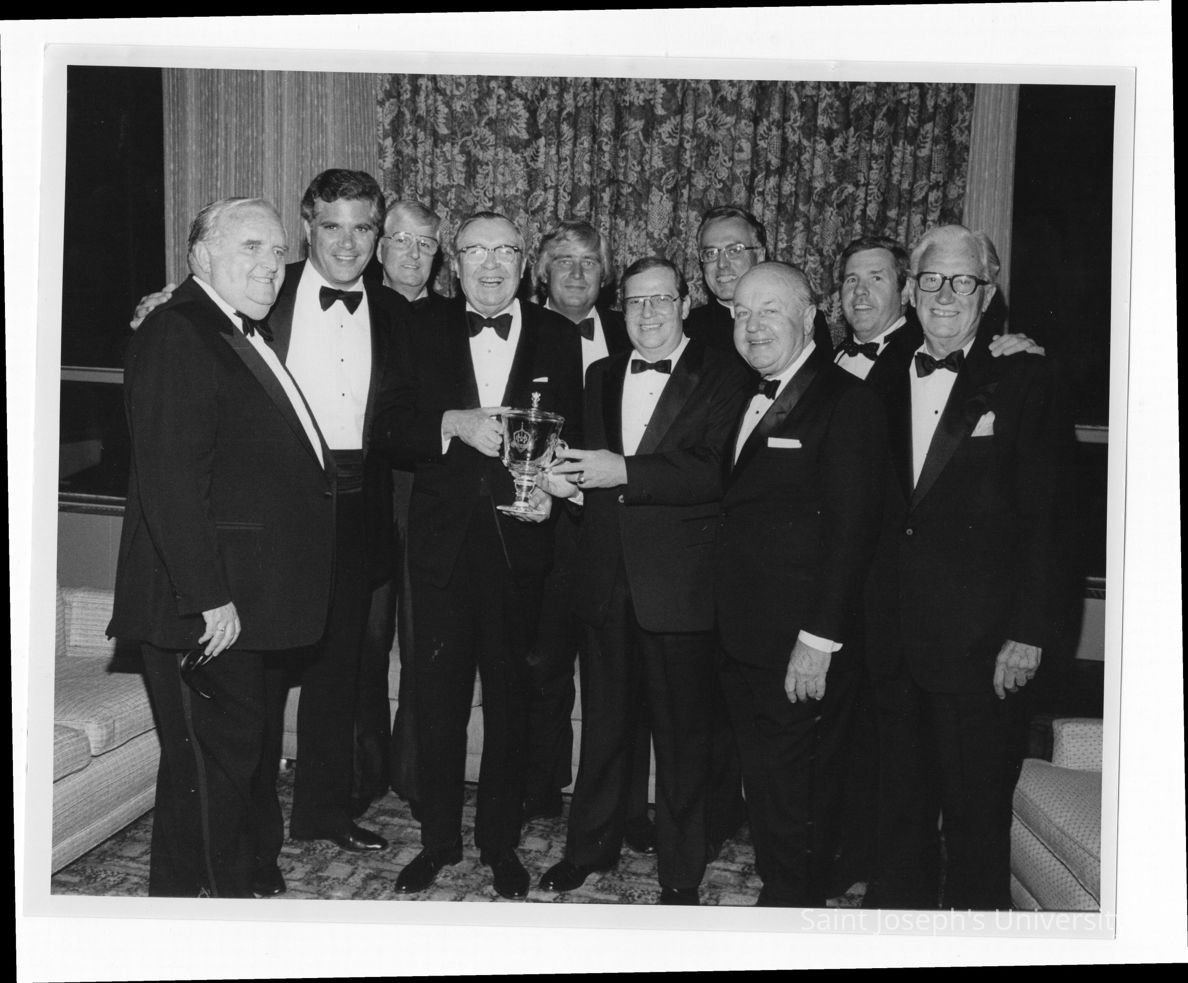 Donald I. MacLean, S.J., and alumni standing with recipient of 1983 Shield of Loyola Award, Paul E. Kelly, class of 1934. Alumni include J. Gallagher, M. Kempski, C. Brennan, A. Tegler, F. Wellock, and Honorable William Cahill.Entry/Object ID