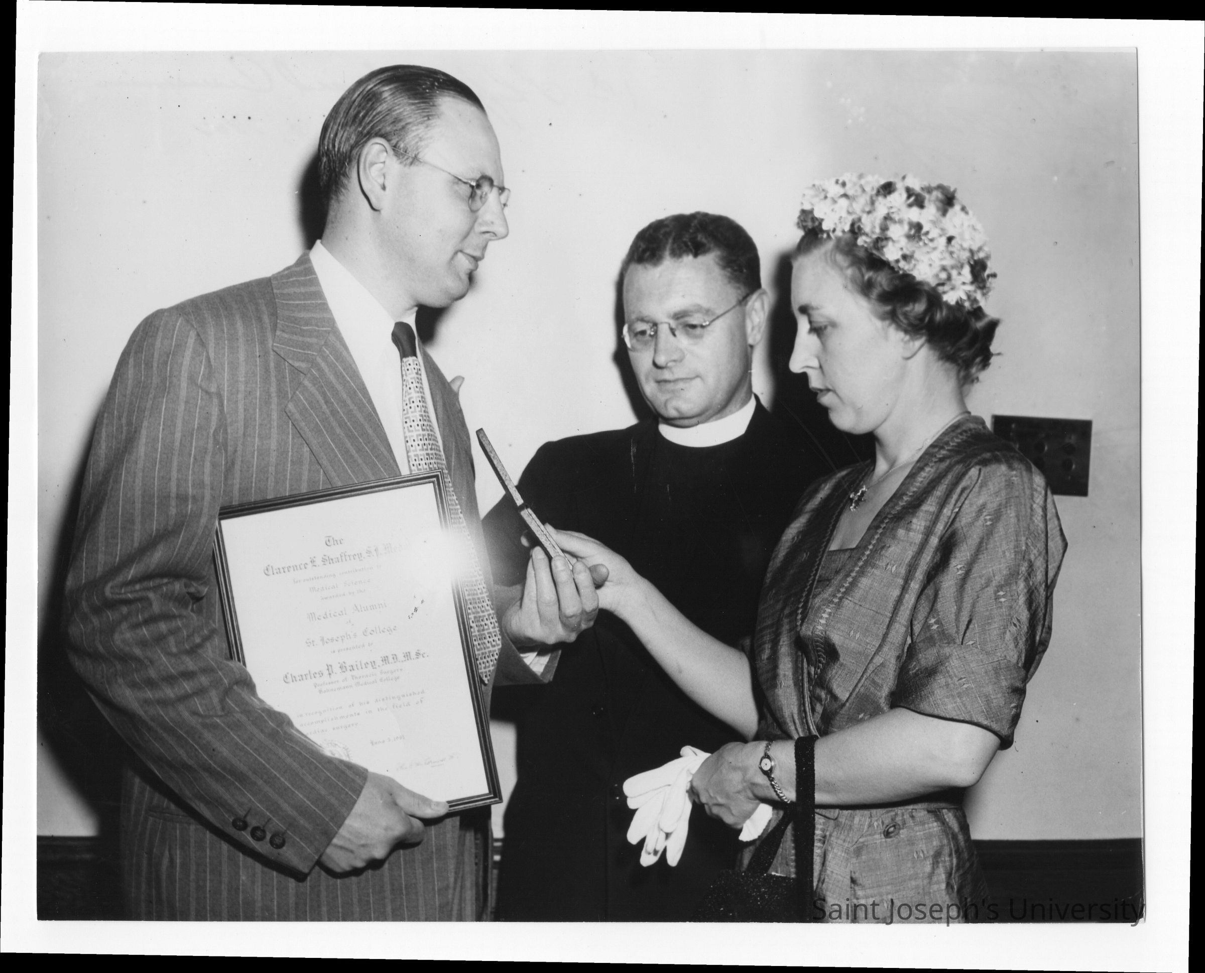 Dr. Charles P. Bailey showing Shaffrey award medal to Edward G. Jacklin, S.J., and his wife, June 3, 1951.