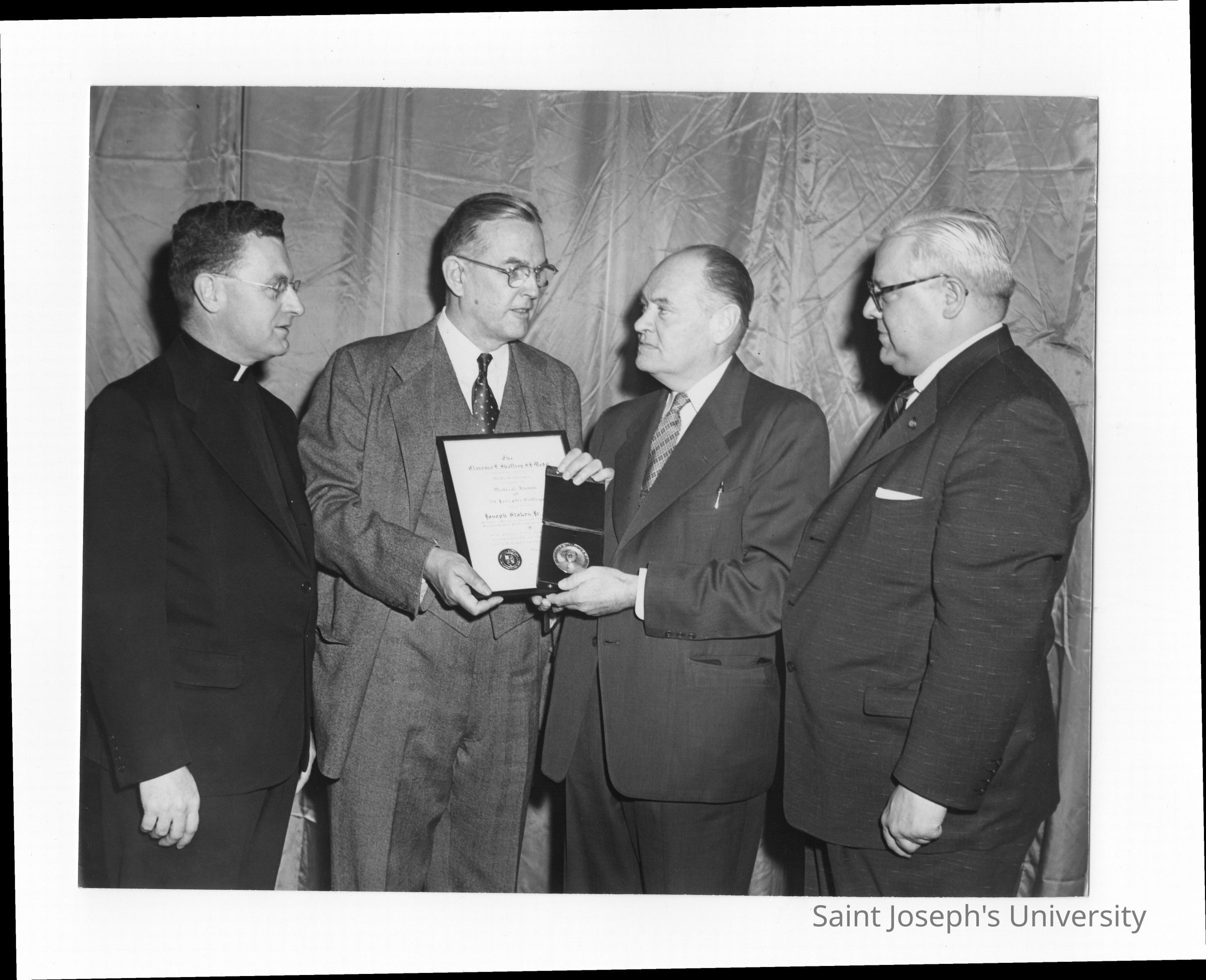 Dr. Joseph Stokes, Jr., showing Shaffrey award medal and certificate to Edward G. Jacklin, S.J., Dr. Myles J. Murphy, and Dr. Robertson in 1954.