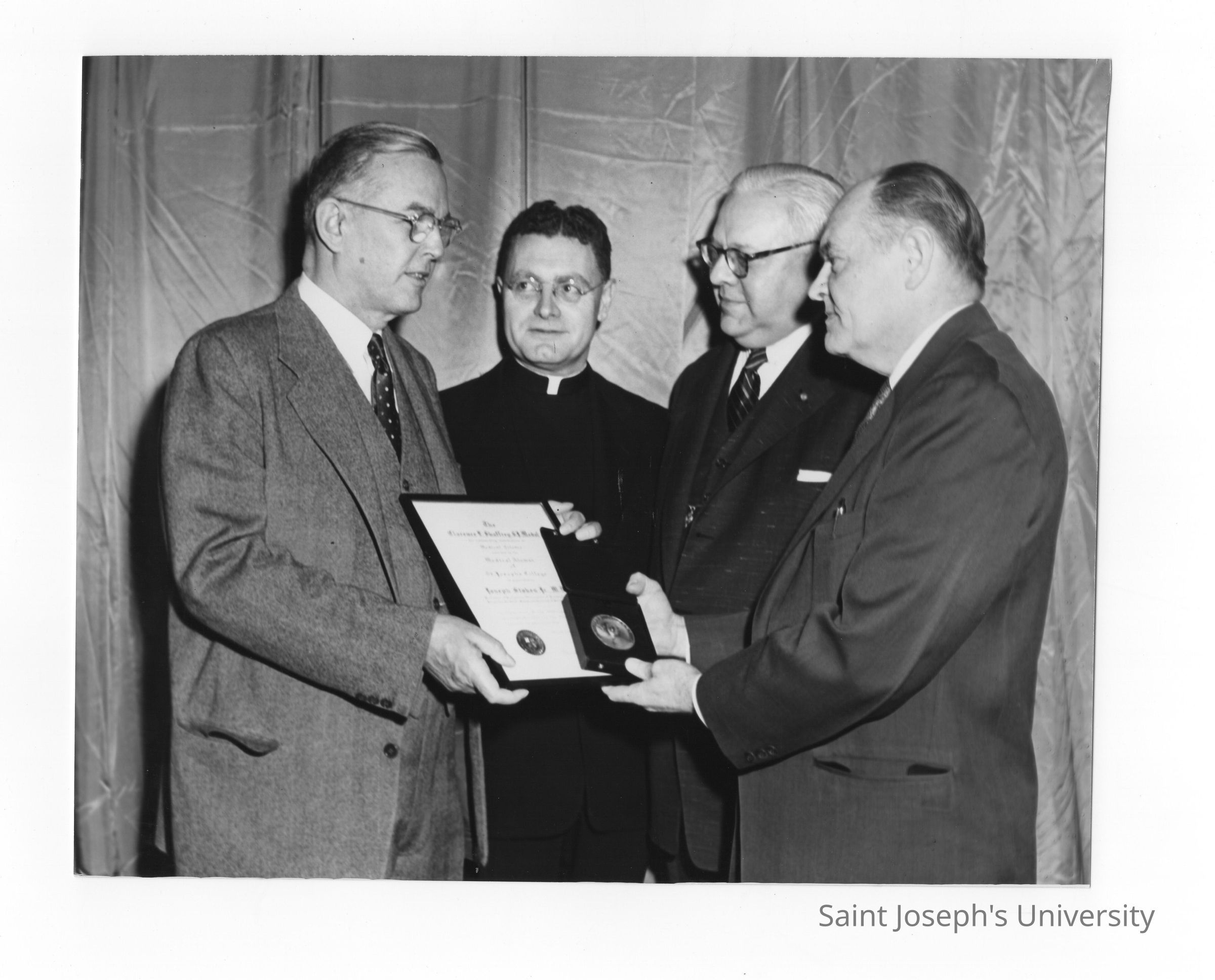 Dr. Joseph Stokes, Jr., showing Shaffrey award medal and certificate to Edward G. Jacklin, S.J., Dr. Myles J. Murphy, and Dr. Robertson in 1954.