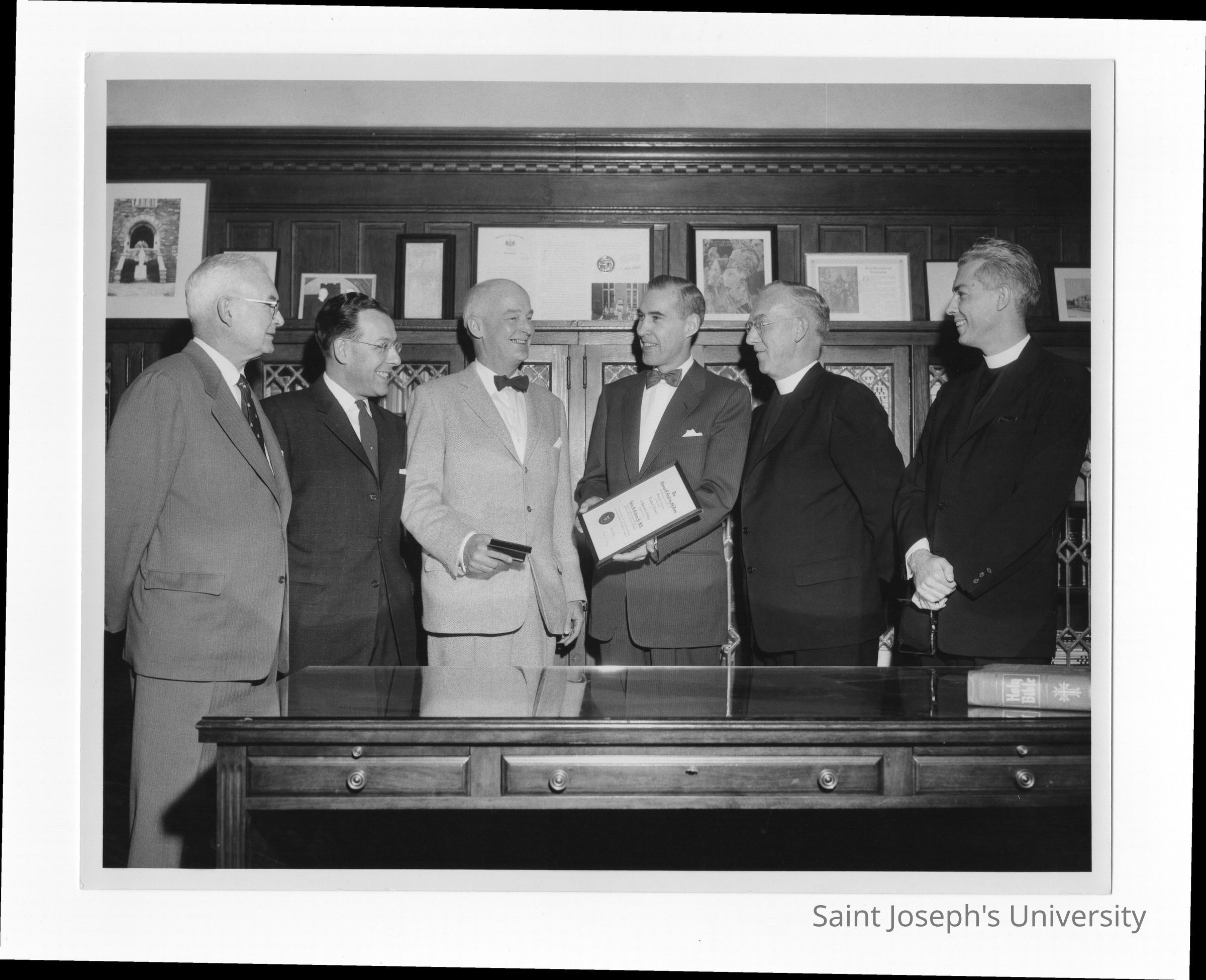Dr. John H. Gibbon, Jr., showing Shaffrey award certificate to J. Joseph Bluett, S.J., Mark A. Bauer, S.J., Dr. Flanigan, Dr. Kane, and Dr. Furey, April 7, 1957.