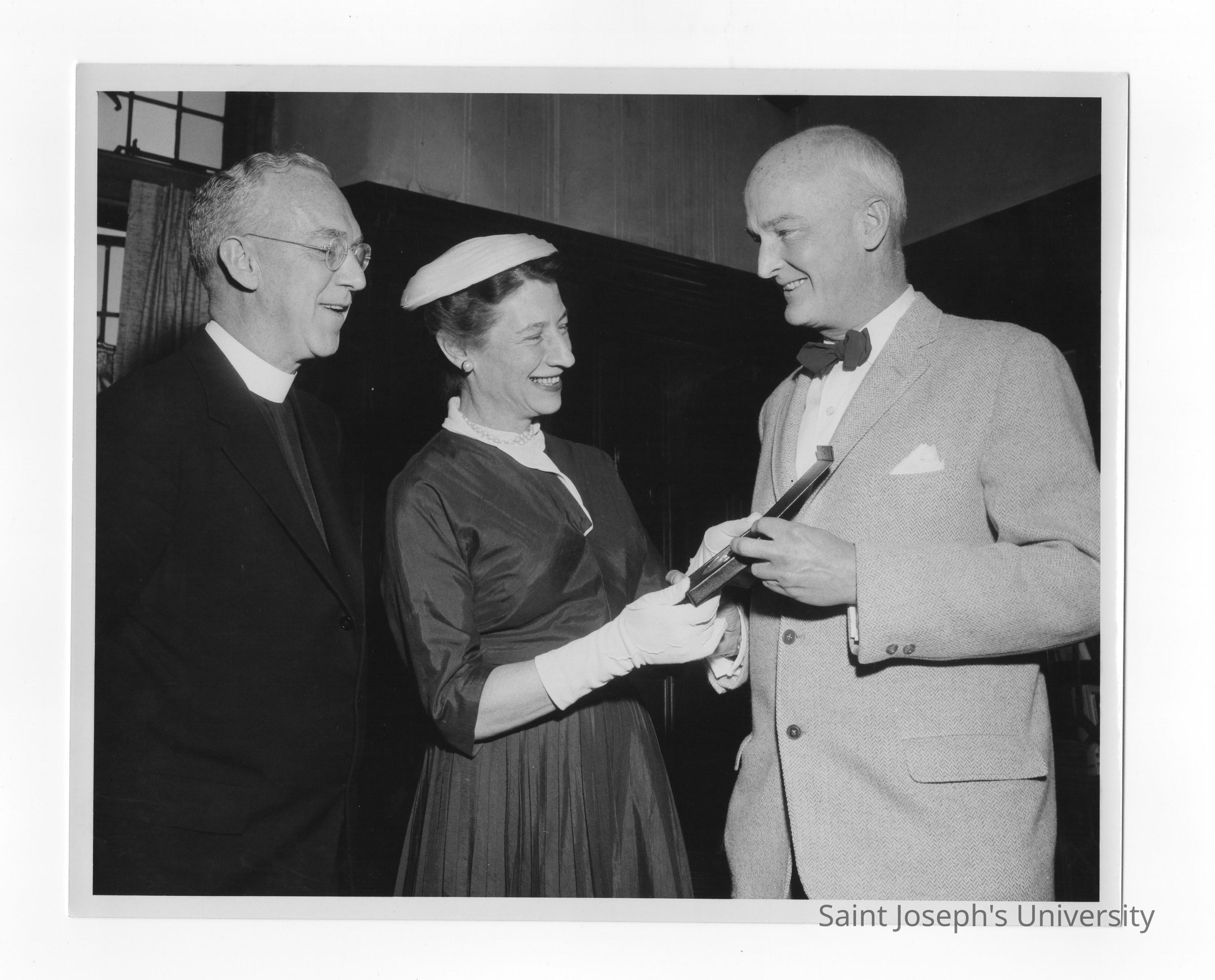 Dr. John H. Gibbon, Jr., showing Shaffrey award certificate and medal to J. Joseph Bluett, S.J.,and Dr. Furey, April 7, 1957.