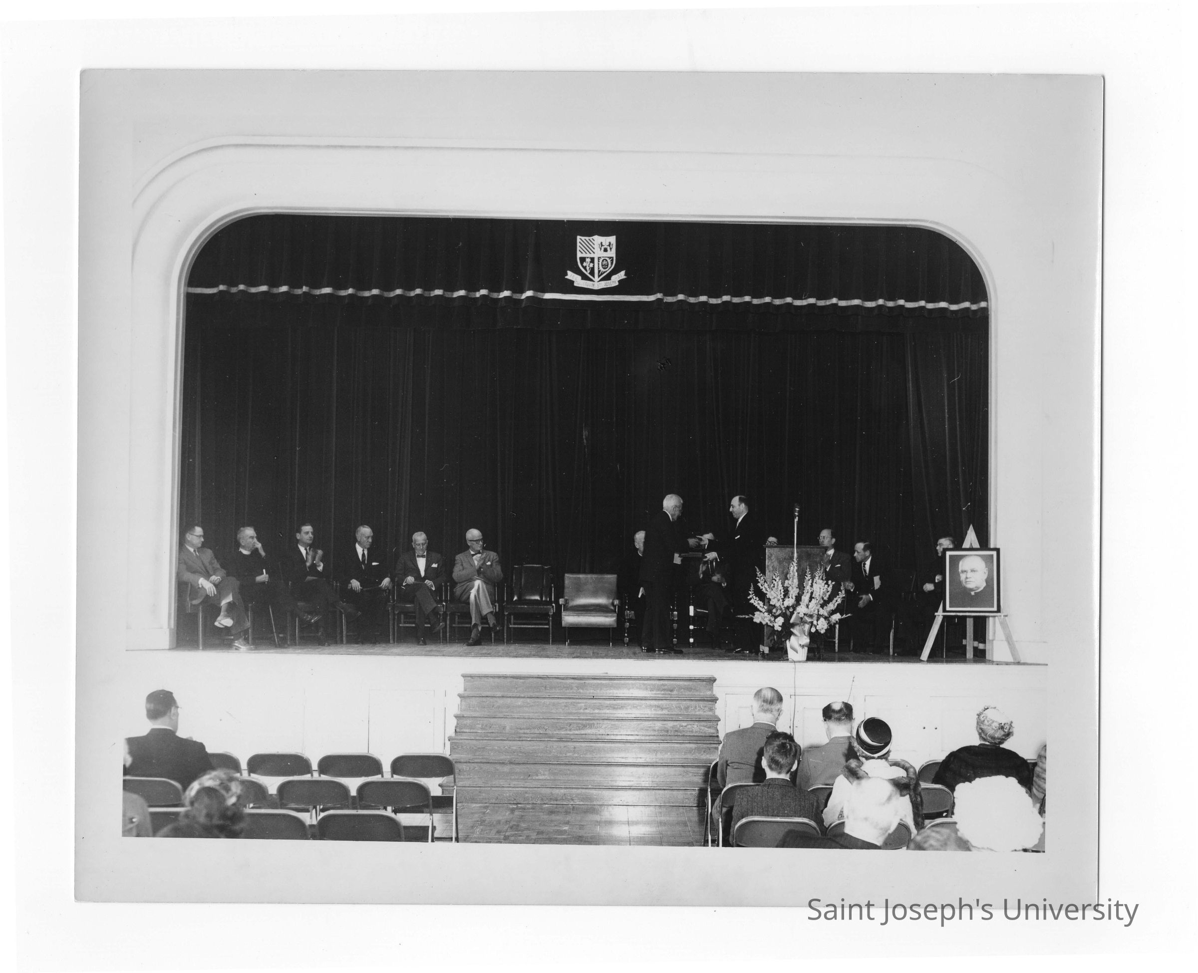 Shaffrey award ceremony for Dr. J. Parsons Schaeffer in Flanigan auditorium, 1959.