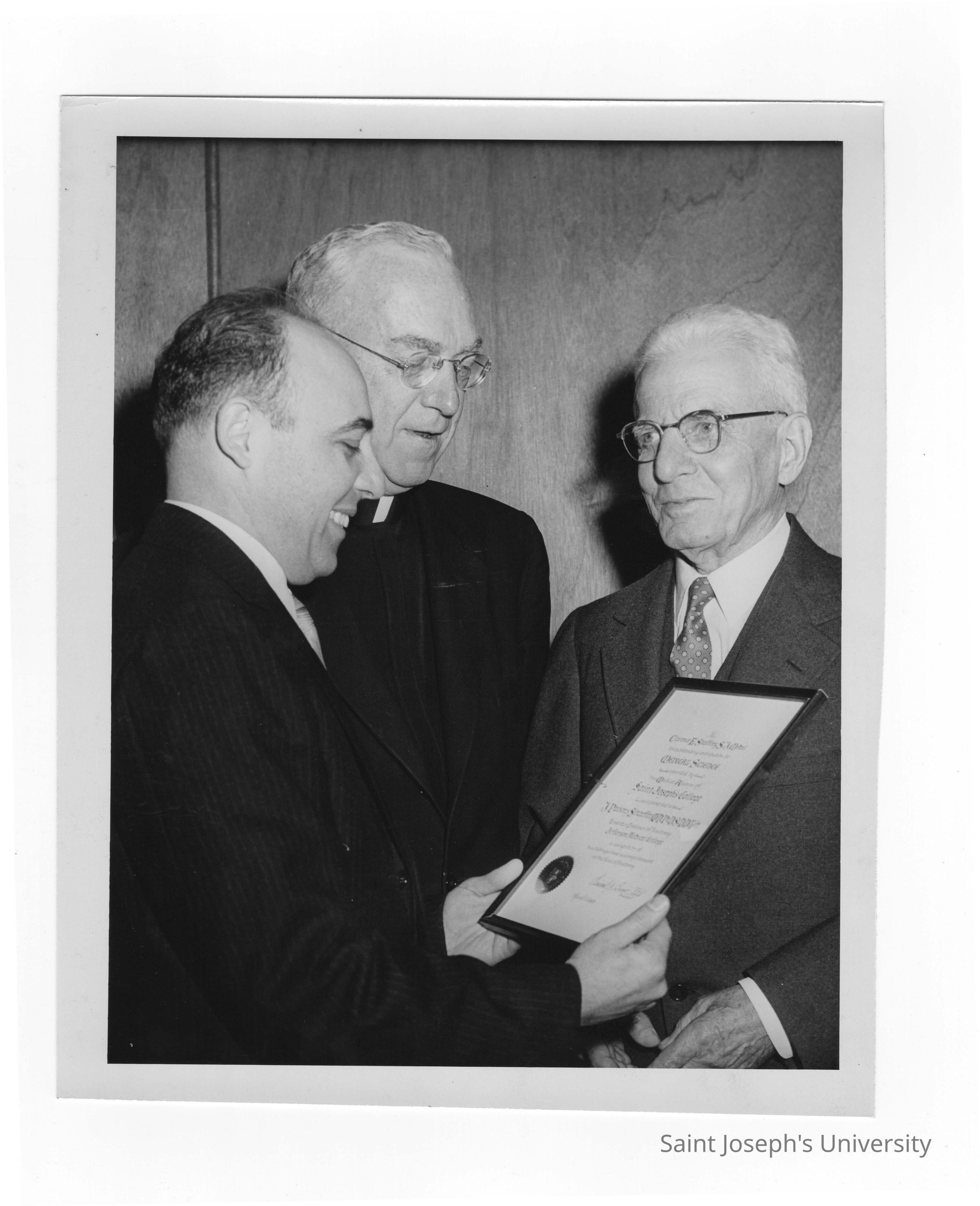 Dr. J. Parsons Schaeffer showing Shaffrey award medal to J. Joseph Bluett, S.J., and Dr. Buono, 1959.